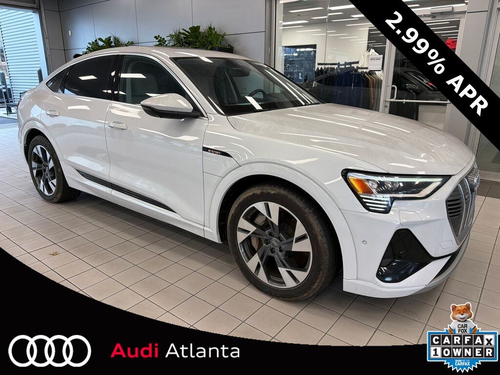 This 2021 Audi e-tron Sportback quattro in Glacier White Metallic with Pearl Beige leather delivers sleek coupe-inspired styling paired with advanced all-electric performance. Powered by dual asynchronous electric motors and a 95 kWh battery with active liquid cooling, this quattro all-wheel drive SUV provides smooth acceleration, adaptive air suspension comfort, and confident year-round capability. Equipped with the Prestige package, it offers top-tier luxury, cutting-edge lighting technology, and immersive premium audio. EPA estimated 76 MPGe city, 78 MPGe highway, 77 MPGe combined with an estimated 218-mile driving range.