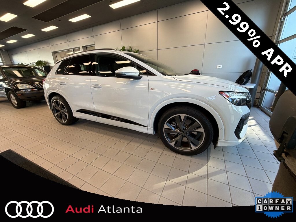 The 2024 Audi Q4 55 e��'tron quattro in Glacier White Metallic is a fully electric luxury SUV combining Audi’s signature quattro all-wheel drive with advanced tech and premium comfort. It offers a sleek exterior, refined black leather interior, and a long electric range with fast-charging capability, making it ideal for both city and highway driving.