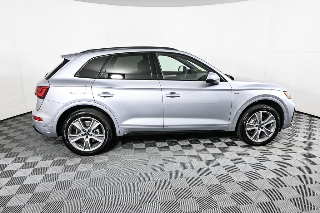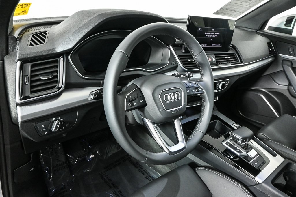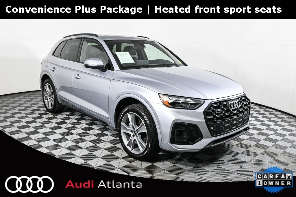The 2025 Audi Q5 S line 45 TFSI quattro in Florett Silver Metallic with Black Leather and Rock Gray stitching blends refined design with dynamic all-weather capability. Equipped with a turbocharged 2.0L engine and quattro® all-wheel drive, it delivers confident performance and premium comfort in every drive. Inside, the cabin surrounds occupants with cutting-edge technology, fine materials, and versatile space ��" showcasing the perfect balance of luxury and practicality.