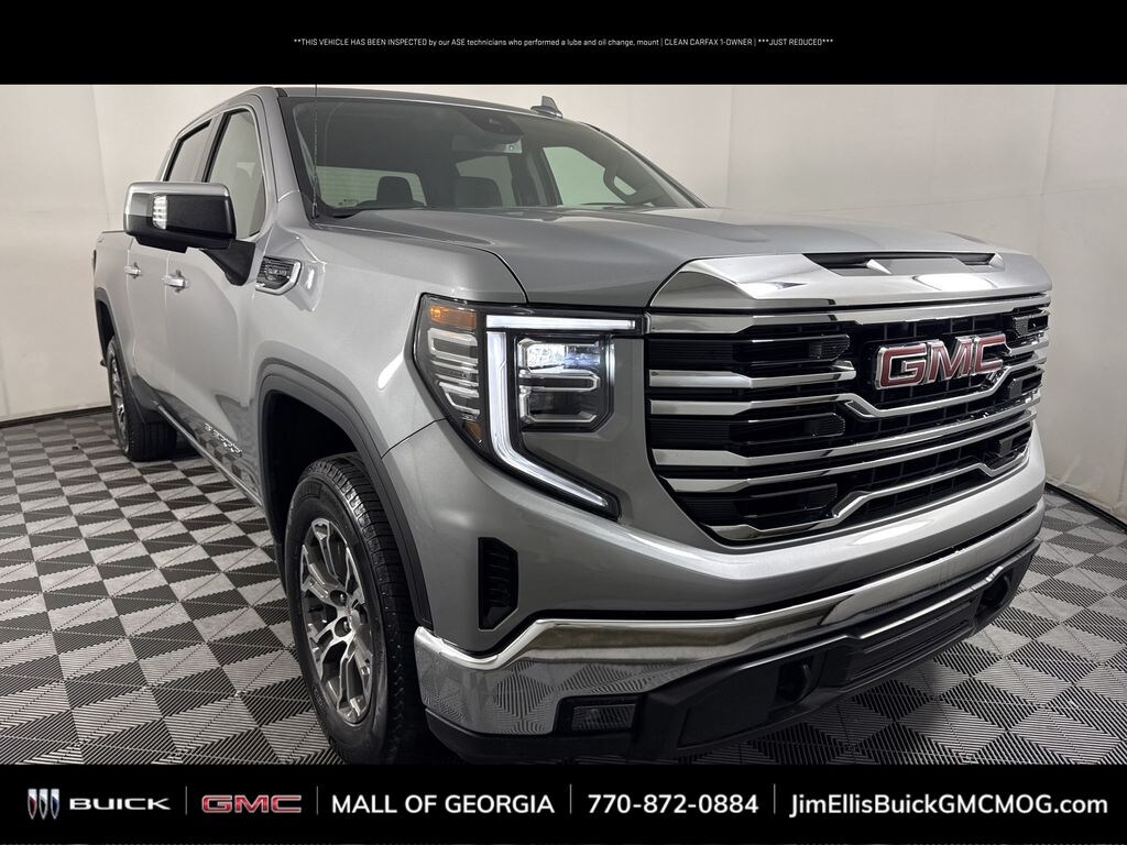 CARFAX One-Owner. Clean CARFAX. Sterling Metallic 2025 GMC Sierra 1500 SLT 4WD 10-Speed Automatic EcoTec3 5.3L V8 **THIS VEHICLE HAS BEEN INSPECTED by our ASE technicians who performed a lube and oil change, mount, CLEAN CARFAX 1-OWNER, ***JUST REDUCED***, Sierra 1500 SLT, EcoTec3 5.3L V8, 10-Speed Automatic, 4WD, Black Leather.