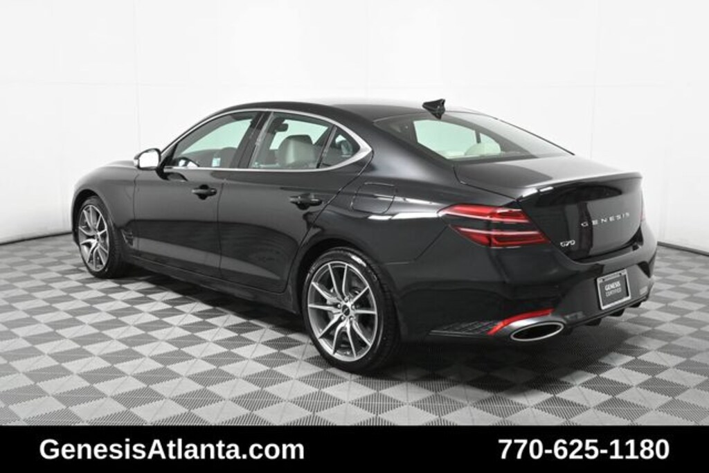 This 2025 Genesis G70 is equipped with Option Group 01, G70 2.5T, Genesis Certified Certified, I4, RWD, Vik Black, Fog Gray Two-Tone w/Leatherette Seating Surfaces or Leather Seating Surfaces, 4-Wheel Disc Brakes, 6 Speakers, ABS brakes, Air Conditioning, Alloy wheels, AM/FM radio: SiriusXM, Android Auto & Apple CarPlay, Anti-whiplash front head restraints, Auto High-beam Headlights, Auto-dimming Rear-View mirror, Automatic temperature control, Brake assist, Bumper Applique, Bumpers: body-color, Delay-off headlights, Driver door bin, Driver vanity mirror, Dual front impact airbags, Dual front side impact airbags, Electronic Stability Control, Emergency communication system: Genesis Connected Services, Exterior Parking Camera Rear, Four wheel independent suspension, Front anti-roll bar, Front Bucket Seats, Front Center Armrest, Front dual zone A/C, Front reading lights, Fully automatic headlights, Garage door transmitter: HomeLink, Heated door mirrors, Heated front seats, Heated Multi-Adjustable Front Bucket Seats, Illuminated Door Scuff Plates, Illuminated entry, Knee airbag, Leatherette Seating Surfaces, Low tire pressure warning, Navigation System, Occupant sensing airbag, Outside temperature display, Overhead airbag, Overhead console, Panic alarm, Passenger door bin, Passenger vanity mirror, Power door mirrors, Power driver seat, Power passenger seat, Power steering, Power windows, Radio: AM/FM/SiriusXM/HD Audio System, Rear anti-roll bar, Rear reading lights, Rear seat center armrest, Rear side impact airbag, Rear window defroster, Remote keyless entry, Reversible Cargo Tray, Security system, Speed control, Speed-Sensitive Wipers, Split folding rear seat, Steering wheel mounted audio controls, Tachometer, Telescoping steering wheel, Traction control, Trip computer, Turn signal indicator mirrors, Variably intermittent wipers, and Wheels: 19" x 8.0J Fr & 19" x 8.5J Rr Alloy.