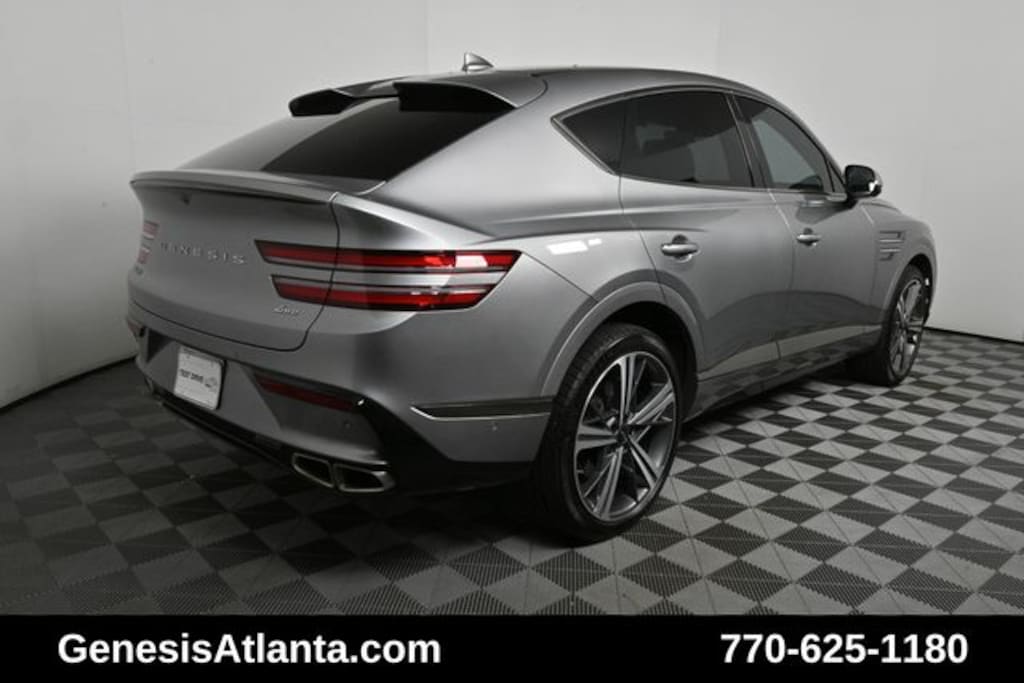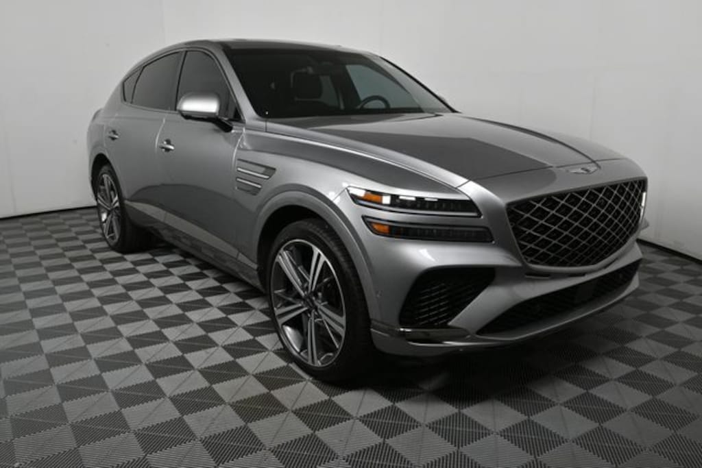 This 2025 Genesis GV80 Coupe is equipped with Option Group 01, GV80 Coupe 3.5T e-SC, Genesis Certified Certified, 4D Sport Utility, 3.5L V6, AWD, Savile Silver, Mono Black w/Gray Stitch w/Nappa Leather Seating Surfaces, 18 Speakers, 4-Wheel Disc Brakes, ABS brakes, Adaptive suspension, Air Conditioning, Alloy wheels, AM/FM radio: SiriusXM, Android Auto & Apple CarPlay, Anti-whiplash front head restraints, Auto High-beam Headlights, Auto tilt-away steering wheel, Auto-dimming door mirrors, Auto-dimming Rear-View mirror, Automatic temperature control, Brake assist, Bumpers: body-color, Compass, Delay-off headlights, Driver door bin, Driver vanity mirror, Dual front impact airbags, Dual front side impact airbags, Electronic Stability Control, Emergency communication system: Genesis Connected Services, Exterior Parking Camera Rear, Four wheel independent suspension, Front anti-roll bar, Front Bucket Seats, Front Center Armrest, Front dual zone A/C, Front reading lights, Fully automatic headlights, Garage door transmitter: HomeLink, Heads-Up Display, Heated door mirrors, Heated front seats, Heated rear seats, Heated steering wheel, Illuminated entry, Knee airbag, Low tire pressure warning, Memory seat, Nappa Leather Seating Surfaces, Navigation System, Occupant sensing airbag, Outside temperature display, Overhead airbag, Overhead console, Panic alarm, Passenger door bin, Passenger vanity mirror, Power door mirrors, Power driver seat, Power Liftgate, Power moonroof, Power passenger seat, Power steering, Power windows, Radio data system, Radio: AM/FM/HD Bang & Olufsen Premium Audio, Rain sensing wipers, Rear air conditioning, Rear anti-roll bar, Rear reading lights, Rear seat center armrest, Rear side impact airbag, Rear window defroster, Remote keyless entry, Security system, Speed control, Speed-sensing steering, Speed-Sensitive Wipers, Split folding rear seat, Spoiler, Sport steering wheel, Steering wheel memory, Steering wheel mounted audio controls, Tachometer, Telescoping steering wheel, Tilt steering wheel, Traction control, Trip computer, Turn signal indicator mirrors, Variably intermittent wipers, Ventilated Front AND Rear Seats, Ventilated front seats, Ventilated rear seats, and Wheels: 22" Dark Gray Matte Sport Alloy.