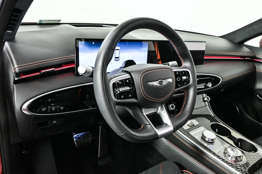 Leather Seats, Navigation, Sunroof, Panoramic Roof, All Wheel Drive, Power Liftgate, Rear Air, Heated Driver Seat, Heated Rear Seat, Cooled Driver Seat Rear Spoiler, MP3 Player, Remote Trunk Release, Privacy Glass. Genesis 3.5T Sport Prestige with Mauna Red exterior and Obsidian Black interior features a V6 Cylinder Engine with 375 HP at 5800 RPM*.