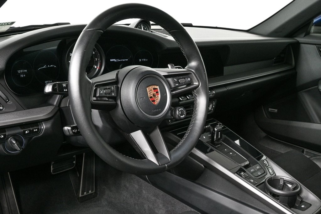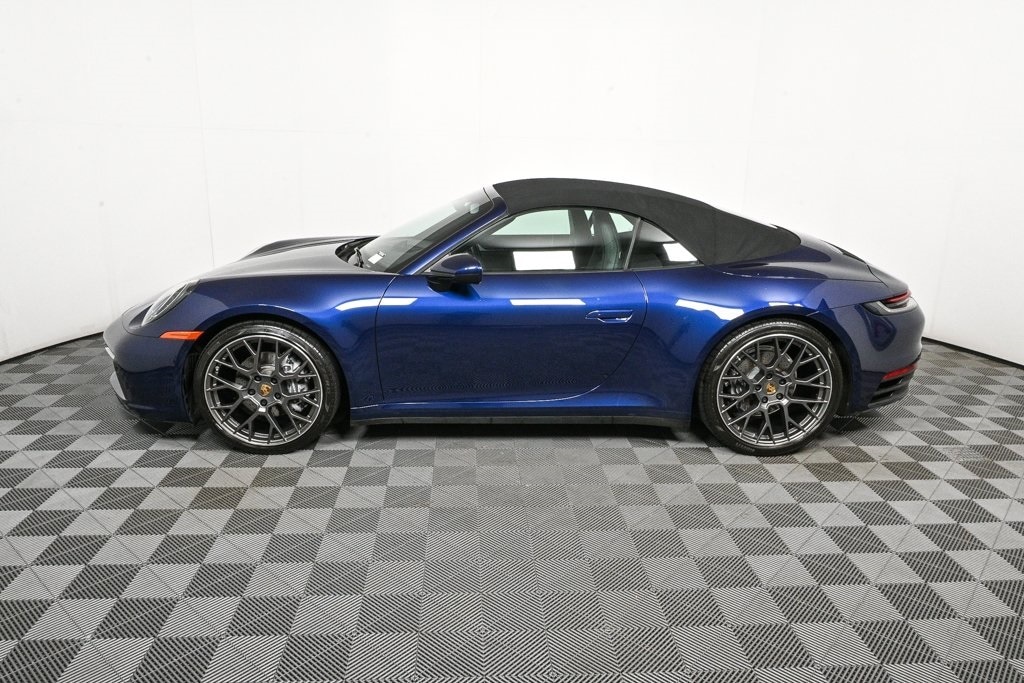 Additional options include the Sport Chrono Package, 20"/21" Carrera S Wheels, Power Sport Seats (14-way) with Memory Package, heated steering wheel, Porsche Crest on front headrests, Lane Change Assist, and colored Porsche Crest wheel center caps.