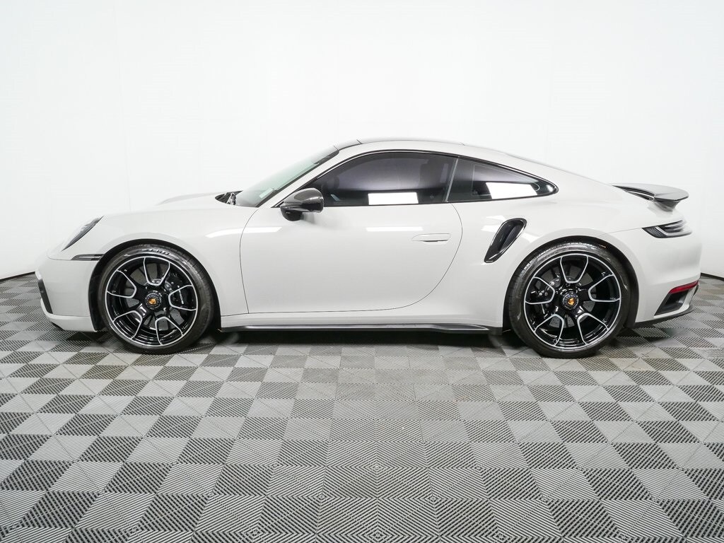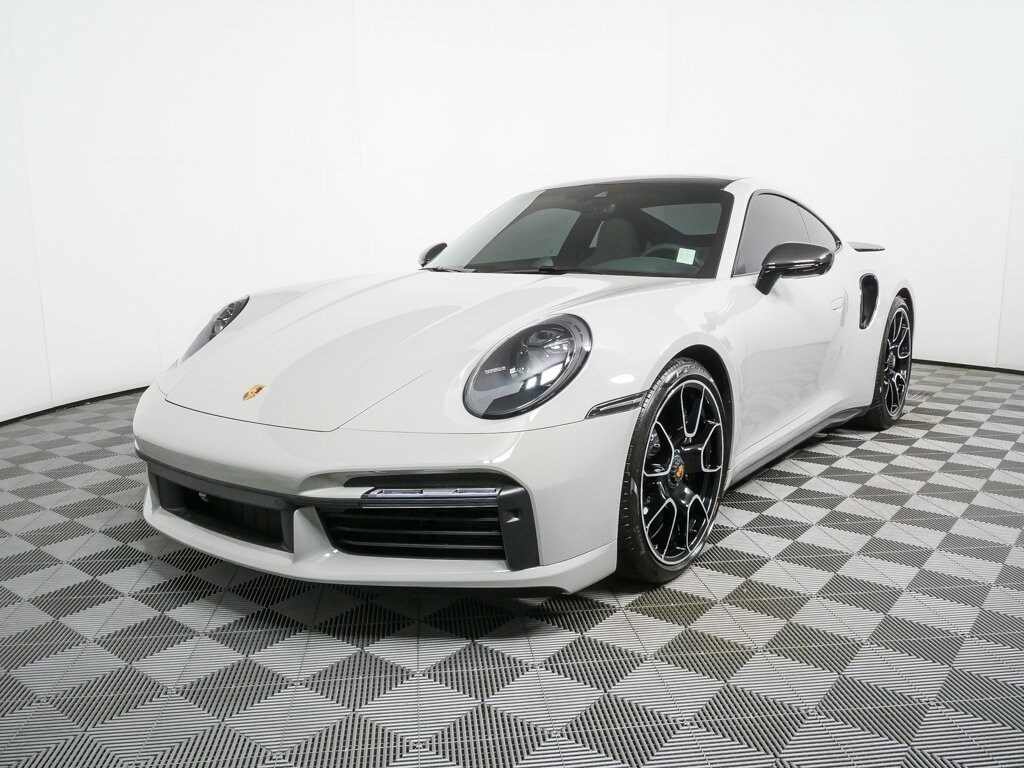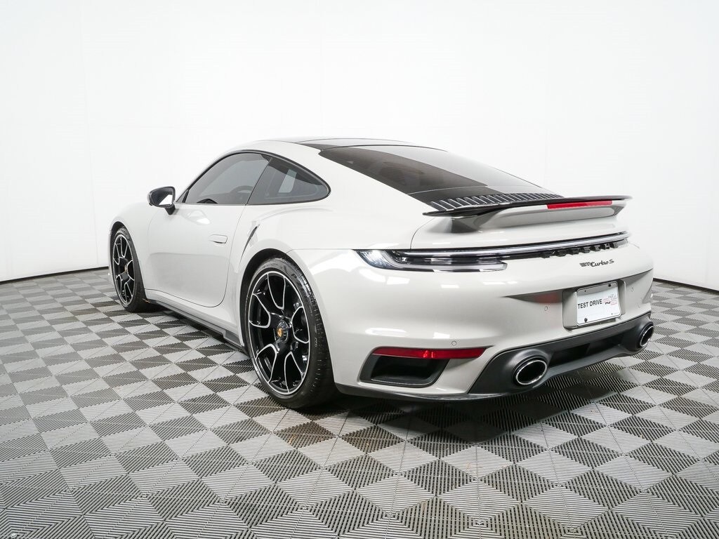 This vehicle is equipped with an electric slide/tilt glass sunroof and extensive high-gloss black exterior detailing, including carbon fiber mirror housings with black lower trim, high-gloss black window trim, rear side air intakes, black âPORSCHEâ rear lettering, and a black â911 Turbo Sâ rear model designation. Additional exterior enhancements include a sport exhaust system with silver tailpipes, aluminum-look fuel cap, wheels painted in high-gloss black, 20-inch front and 21-inch rear 911 Turbo S Exclusive Design wheels, clear taillights, LED-Matrix Design headlights in black with Porsche Dynamic Light System Plus, and Surround View with a 360-degree camera system.