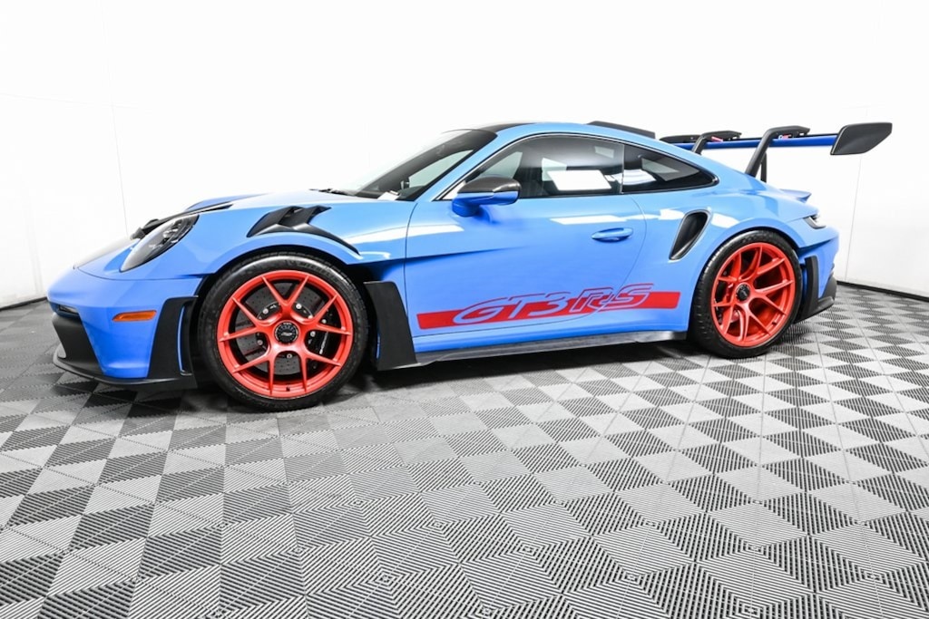 This build features the Weissach Package along with several performance, styling, and comfort upgrades. Highlights include the accent package logos in Pyro Red, front axle lift system, Porsche Ceramic Composite Brakes with high gloss black calipers, extended range fuel tank, and 20"/21" GT3 RS forged lightweight magnesium wheels. Additional details include wheels painted in Satin Pyro Red, vehicle keys painted with Race-Tex pouch in Guards Red, seat belts, central tachometer, and Chrono stopwatch dial in Guards Red, as well as black door pull loops, aluminum pedals and footrest, Race-Tex sun visors, and a fire extinguisher. Technology and convenience upgrades include the BOSE® Surround Sound System, LED-Matrix Design Headlights in Black with Porsche Dynamic Light System Plus, exclusive design taillights, auto-dimming mirrors with rain sensor, ParkAssist rear, and the smoking package.