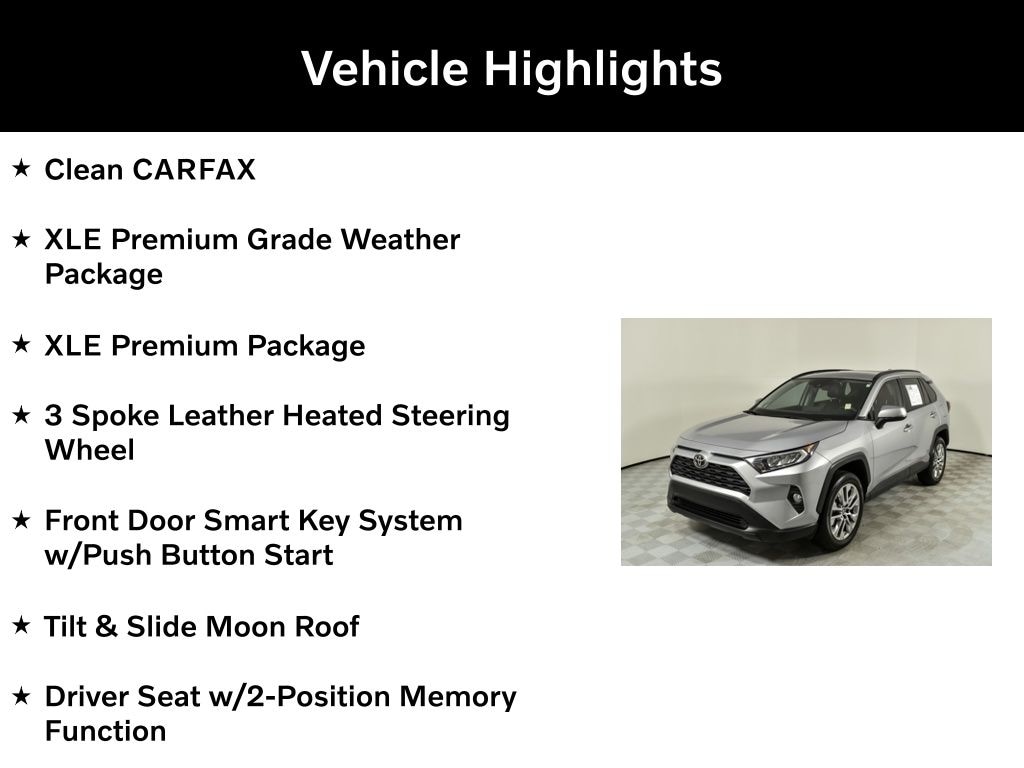 Clean CARFAX. Certified. Silver Sky Metallic 2021 Toyota RAV4 XLE Premium FWD 8-Speed Automatic 2.5L 4-Cylinder DOHC Dual VVT-i Clean CARFAX, Black w/SofTex Seat Trim, 3 Spoke Leather Heated Steering Wheel, Driver Seat w/2-Position Memory Function, Front Door Smart Key System w/Push Button Start, Front Seat Heating, Rain Sensing Front Wipers, Tilt & Slide Moon Roof, Wiper Deicer, XLE Premium Grade Weather Package, XLE Premium Package.