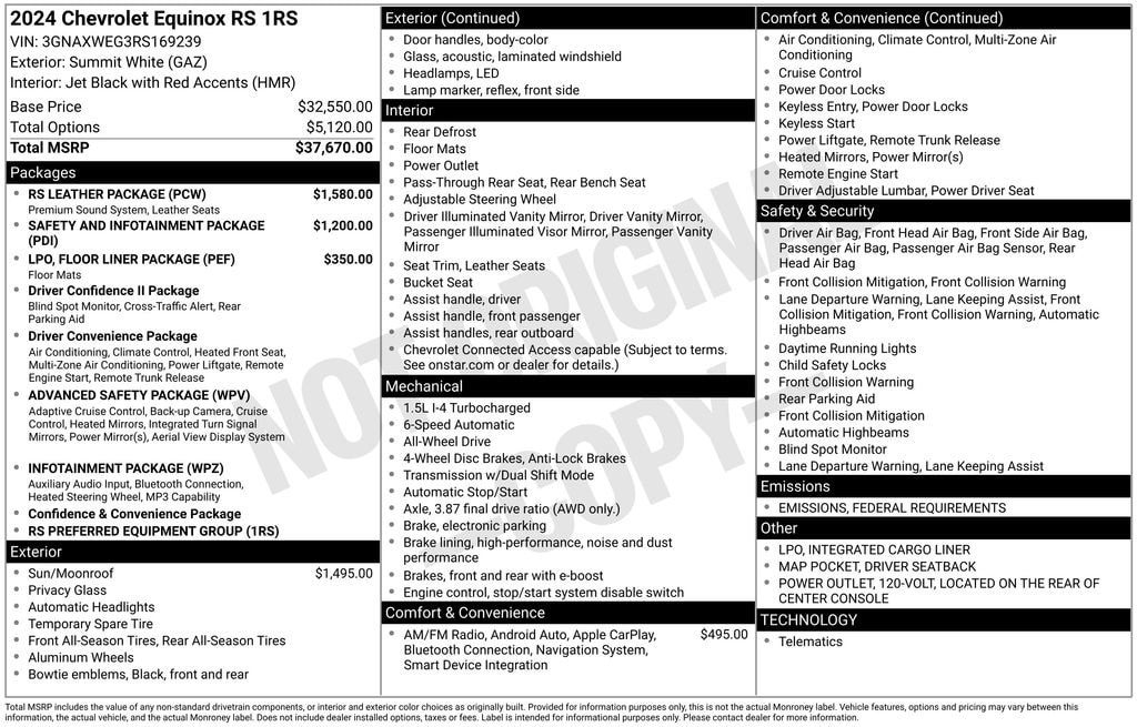 Jim Ellis Chevrolet is pleased to offer this attractive 2024 Chevrolet Equinox RS in Summit White Beautifully equipped with Advanced Safety Package (Adaptive Cruise Control, HD Surround Vision, and Outside Heated Power-Adjustable Mirrors), Floor Liner Package (LPO) (All-Weather Floor Liners (LPO) and Integrated Cargo Liner (LPO)), Infotainment Package (120-Volt Power Outlet, 2 Rear USB Charging-Only Ports, 2 USB Data Ports, 2 USB Data Ports w/SD Card Reader, Bluetooth® For Phone, Heated Steering Wheel, Radio: Chevrolet Infotainment 3 Plus System, and SiriusXM), Preferred Equipment Group 1RS, RS Leather Package (Bose Premium 7-Speaker Audio System Feature, Driver Seatback Map Pocket, and Perforated Leather-Appointed Seat Trim), Safety & Infotainment Package, AWD, 19 Aluminum Wheels, 2 USB Ports & Auxiliary Input Jack, 2-Way Power Driver Lumbar Control Seat Adjuster, 3.87 Final Drive Axle Ratio, 4-Wheel Disc Brakes, 6 Speakers, 6-Speaker Audio System Feature, ABS brakes, Air Conditioning, Alloy wheels, AM/FM radio: SiriusXM, Auto High-beam Headlights, Automatic temperature control, Brake assist, Bumpers: body-color, Compass, Cruise Control, Delay-off headlights, Driver 8-Way Power Seat Adjuster, Driver door bin, Driver vanity mirror, Dual front impact airbags, Dual front side impact airbags, Electronic Stability Control, Emergency communication system: OnStar and Chevrolet connected services capable, Four wheel independent suspension, Front anti-roll bar, Front Bucket Seats, Front Center Armrest, Front dual zone A/C, Front Passenger 4-Way Manual Seat Adjuster, Front reading lights, Fully automatic headlights, Heated door mirrors, Heated Driver & Front Passenger Seats, Heated front seats, Illuminated entry, Low tire pressure warning, Occupant sensing airbag, Outside temperature display, Overhead airbag, Overhead console, Panic alarm, Passenger door bin, Passenger vanity mirror, Power door mirrors, Power driver seat, Power Liftgate, Power steering, Power Sunroof, Power windows, Premium audio system: Chevrolet Infotainment 3, Premium Cloth Seat Trim, Radio data system, Radio: Chevrolet Infotainment 3 Plus System w/Navi, Radio: Chevrolet Infotainment 3 System w/AM/FM, Rear anti-roll bar, Rear reading lights, Rear seat center armrest, Rear window defroster, Rear window wiper, Remote keyless entry, Roof rack: rails only, Security system, Speed-sensing steering, Split folding rear seat, Spoiler, Steering wheel mounted audio controls, Tachometer, Telescoping steering wheel, Tilt steering wheel, Traction control, Trip computer, and Variably intermittent wipers! AWD.