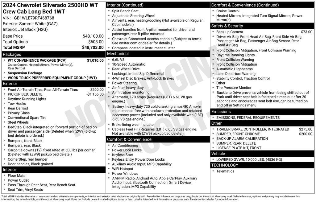 Jim Ellis Chevrolet is excited to offer this hard-working 2024 Chevrolet Silverado 2500HD Work Truck in Summit White Beautifully equipped with Preferred Equipment Group 1WT (170 Amp Alternator, 3.5 Diagonal Monochromatic Display DIC, Black Front Bumper, Black Mirror Caps, Black Rear Bumper, Bluetooth® For Phone, Chevrolet Connected Access Capable, Compass, HD Rear Vision Camera, High-Visibility Vertical Trailering Mirrors, Locking Tailgate, Manual Tailgate Function w/No EZ Lift, Manual Tilt-Wheel Steering Column, OnStar & Chevrolet Connected Services Capable, Power Door Locks, Power Front Windows w/Driver Express Up/Down, Power Rear Windows w/Express Down, Push Button Start, Rear 60/40 Folding Bench Seat (Folds Up), Remote Keyless Entry, Rubberized-Vinyl Floor Covering, Solar Absorbing Tinted Glass, Standard Tailgate, Wi-Fi Hotspot Capable, and Wireless Phone Projection), Suspension Package, WT Convenience Package (Deep-Tinted Glass, Electric Rear-Window Defogger, Electronic Cruise Control w/Set & Resume Speed, EZ Lift Power Lock & Release Tailgate, and Heated Vertical Trailering Mirrors), 10-Speed Automatic, Jet Black Vinyl, 3.73 Rear Axle Ratio, 4-Wheel Disc Brakes, 6 Speakers, 6-Speaker Audio System, 720 Cold-Cranking Amps Heavy-Duty Battery, ABS brakes, Air Conditioning, AM/FM radio, Apple CarPlay/Android Auto, Auto High-beam Headlights, Brake assist, Chrome Front Bumper, Delay-off headlights, Driver door bin, Dual front impact airbags, Dual front side impact airbags, Durabed Pickup Bed, Electronic Stability Control, Front 40/20/40 Split-Bench Seats w/Lockable Storage, Front anti-roll bar, Front Center Armrest w/Storage, Front License Plate Kit, Front reading lights, Front wheel independent suspension, Fully automatic headlights, Illuminated entry, Integrated Trailer Brake Controller, Low tire pressure warning, Occupant sensing airbag, Outside temperature display, Overhead airbag, Overhead console, Panic alarm, Passenger door bin, Passenger vanity mirror, Power steering, Power windows, Premium audio system: Chevrolet Infotainment 3, Radio: Chevrolet Infotainment 3 System, Rear reading lights, Rear step bumper, Remote keyless entry, Split folding rear seat, Tachometer, Tilt steering wheel, Traction control, Trip computer, Variably intermittent wipers, Vinyl Seat Trim, Voltmeter, and Wheels: 17 Silver Painted Steel! 10-Speed Automatic, Jet Black Vinyl.