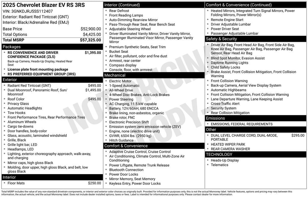 Jim Ellis Chevrolet is delighted to offer this gorgeous-looking 2025 Chevrolet Blazer EV RS in Radiant Red Tintcoat Beautifully equipped with Preferred Equipment Group 3RS, RS Convenience & Driver Confidence Package (Head-Up Display, Heated Rear Outboard Passenger Cushion, and Heated Wiper Park), 2-Way Power Driver Lumbar Seat Adjuster, 4-Wheel Disc Brakes, 6 Speakers, 6-Speaker Audio System Feature, 8-Way Power Driver Seat Adjuster, ABS brakes, Air Conditioning, Alloy wheels, AM/FM radio: SiriusXM with 360L, Auto High-beam Headlights, Auto-dimming door mirrors, Auto-dimming Rear-View mirror, Automatic temperature control, Black Roof, Brake assist, Bumpers: body-color, Compass, Cruise Control, Delay-off headlights, Driver & Front Passenger Ventilated Seats, Driver door bin, Driver vanity mirror, Dual front impact airbags, Dual front side impact airbags, Dual Level Charge Cord, Electronic Stability Control, Emergency communication system: OnStar and Chevrolet connected services capable, Four wheel independent suspension, Front & Rear All-Weather Floor Liners (LPO) (DISC), Front anti-roll bar, Front Bucket Seats, Front Center Armrest, Front dual zone A/C, Front Passenger 2-Way Power Lumbar Seat Adjuster, Front Passenger 6-Way Power Seat Adjuster, Front reading lights, Fully automatic headlights, Garage door transmitter, Heated door mirrors, Heated Driver & Fr Passenger Seats Cushion & Seatback, Heated front seats, Heated steering wheel, Illuminated entry, Knee airbag, Low tire pressure warning, Memory seat, Navigation System, Occupant sensing airbag, Outside temperature display, Overhead airbag, Overhead console, Panic alarm, Passenger door bin, Passenger vanity mirror, Perforated Suede/Evotex Seat Trim, Power door mirrors, Power driver seat, Power Dual Panel Panoramic Sliding Sunroof, Power Liftgate, Power passenger seat, Power steering, Power windows, Radio: 17.7 Diagonal Advanced Color LCD Display, Rain sensing wipers, Rear anti-roll bar, Rear Camera Washer, Rear reading lights, Rear seat center armrest, Rear window defroster, Rear window wiper, Remote keyless entry, Ride & Handling Suspension, Security system, SiriusXM w/360L Trial Subscription, Split folding rear seat, Spoiler, Sport steering wheel, Steering wheel mounted audio controls, Telescoping steering wheel, Tilt steering wheel, Traction control, Trip computer, Turn signal indicator mirrors, Variably intermittent wipers, Ventilated front seats, and Wheels: 21 Machined-Face Aluminum!Call our internet team today @ 678-534-7320 to schedule a hassle free test drive! We are located at: 5900 Peachtree Industrial Blvd, Atlanta, GA, 30341. Price does not include Tax, Title and Dealer Fees. $3500 - Chevrolet GM Financial APR & NCC Consumer Cash Program: $3500 discount and 6.59% APR for 36 months. $30.69 per $1000 financed. Available to well qualified buyers who finance through GM Financial. XGQ, NCC. Exp. 12/01/2025