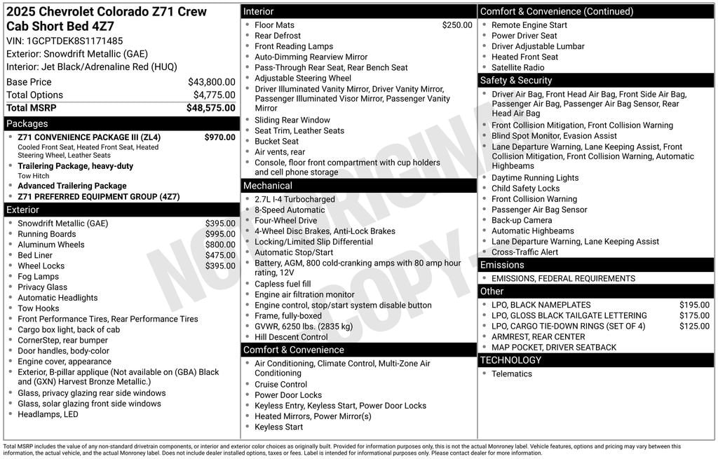 Jim Ellis Chevrolet is very proud to offer this attractive 2025 Chevrolet Colorado Z71 in Snowdrift Metallic Beautifully equipped with Preferred Equipment Group 4Z7 (Automatic Emergency Braking, Chevy Safety Assist, Following Distance Indicator, Forward Collision Alert, Front Pedestrian & Bicyclist Braking, IntelliBeam Automatic High Beam On/Off, and Lane Keep Assist w/Lane Departure Warning), Z71 Convenience Package III (Driver & Front Passenger Ventilated Seats, Driver Memory Settings, Driver Seatback Map Pocket, Heated Steering Wheel, Perforated Leather-Appointed Seat Trim, and Rear Center Armrest), 4WD, 1st & 2nd Row All-Weather Floor Liner (LPO), 3.42 Rear Axle Ratio, 4-Way Manual Passenger Seat Adjuster, 4-Wheel Disc Brakes, 6 Speakers, 6-Speaker Audio System Feature, 8-Way Power Driver Seat Adjuster, ABS brakes, Air Conditioning, Alloy wheels, AM/FM radio: SiriusXM, Apple CarPlay/Android Auto, Auto High-beam Headlights, Auto-dimming Rear-View mirror, Automatic temperature control, Black Lug Nut & Wheel Lock Kit (LPO), Black Nameplates (LPO), Black Spray-On Bedliner w/Chevrolet Logo, Brake assist, Bumpers: body-color, Cargo Tie-Down Rings (Set of 4) (LPO), Cloth/Evotex Seat Trim, Compass, Cruise Control, Delay-off headlights, Driver door bin, Driver vanity mirror, Dual front impact airbags, Dual front side impact airbags, Electronic Stability Control, Emergency communication system: OnStar, Front anti-roll bar, Front Bucket Seats, Front Center Armrest, Front dual zone A/C, Front fog lights, Front Passenger Seatback Map Pocket, Front reading lights, Front wheel independent suspension, Gloss Black Tailgate Lettering (LPO), Heated door mirrors, Heated Driver & Front Passenger Seats, Heated front seats, Illuminated entry, Low tire pressure warning, Navigation System, Occupant sensing airbag, Off-Road Assist Steps (LPO), Outside temperature display, Overhead airbag, Overhead console, Panic alarm, Passenger door bin, Passenger vanity mirror, Power door mirrors, Power Driver Lumbar Control Seat Adjuster, Power driver seat, Power steering, Power windows, Radio data system, Radio: 11.3 Diagonal Advanced Color LCD Display, Rear reading lights, Rear step bumper, Rear window defroster, Remote keyless entry, Security system, SiriusXM Trial Subscription, Speed-sensing steering, Split folding rear seat, Steering Wheel Mounted Audio Controls, Steering wheel mounted audio controls, Tachometer, Telescoping steering wheel, Tilt steering wheel, Traction control, Trip computer, Variably intermittent wipers, Wheels: 18 x 8.5 Android Dark Full Gloss Aluminum, Wheels: 20 x 9 High Gloss Black Aluminum, and Wireless Phone Projection! 4WD.