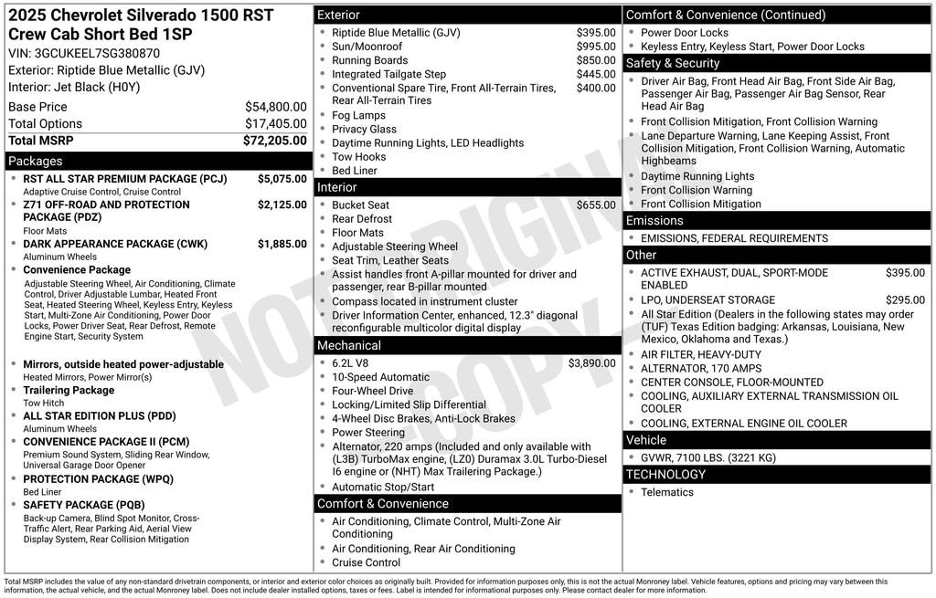 Jim Ellis Chevrolet is very proud to offer this hard-working 2025 Chevrolet Silverado 1500 RST in Riptide Blue Metallic Beautifully equipped with All Star Edition Plus (Wheels: 20 x 9 Painted Aluminum), Convenience Package (10-Way Power Driver Seat w/Lumbar, 120-Volt Bed Mounted Power Outlet, 120-Volt Interior Power Outlet, Dual Rear USB Ports (Charge Only), Dual-Zone Automatic Climate Control, Electric Rear-Window Defogger, Heated Driver & Front Outboard Passenger Seats, Heated Steering Wheel, Keyless Open & Start, LED Cargo Area Lighting, Manual Tilt/Telescoping Steering Column, Remote Vehicle Starter System, Theft Deterrent System (Unauthorized Entry), and Wrapped Steering Wheel), Convenience Package II (Hitch Guidance w/Hitch View, In-Vehicle Trailering System App, Power Sliding Rear Window w/Rear Defogger, Premium Bose 7-Speaker Sound System, and Universal Home Remote), Dark Appearance Package (Wheels: 20 x 9 High Gloss Black Painted Alum), High Capacity Suspension Package, Leather Package (Leather-Appointed Front Seat Trim), Preferred Equipment Group 1SP (12.3 Multicolor Reconfigurable Digital Display, 6-Speaker Audio System, All-Star Edition, Auto-Locking Rear Differential, Bluetooth® For Phone, Color-Keyed Carpeting Floor Covering, Deep-Tinted Glass, Electronic Cruise Control, EZ Lift Power Lock & Release Tailgate, Front Frame-Mounted Black Recovery Hooks, Front LED Fog Lamps, Front Rubberized Vinyl Floor Mats, HD Rear Vision Camera, Heated Power-Adjustable Outside Mirrors, High Gloss Black Mirror Caps, Inside Rear-View Mirror w/Tilt, Integrated Trailer Brake Controller, OnStar Services Capable, Power Front Windows w/Driver Express Up/Down, Power Front Windows w/Passenger Express Down, Power Rear Windows w/Express Down, Rear 60/40 Folding Bench Seat (Folds Up), Rear Rubberized-Vinyl Floor Mats, SiriusXM w/360L Trial Subscription, Standard Tailgate, Steering Wheel Audio Controls, Teen Driver, Tire Pressure Monitoring System, and Wi-Fi Hot Spot Capable), Protection Package (Chevytec Spray-On Black Bedliner and Rear Wheelhouse Liners), RST All Star Premium Package (Adaptive Cruise Control), Safety Package (HD Surround Vision, Perimeter Lighting, Rear Cross Traffic Braking, Rear Pedestrian Alert, Trailer Camera Provisions, Trailer Side Blind Zone Alert, and Ultrasonic Front & Rear Park Assist), Standard Suspension Package, Trailering Package (Hitch Guidance), Up-Level Rear Seat w/Storage Package, Z71 Off-Road & Protection Package (All-Weather Floor Liner (LPO) (AAK)), Z71 Off-Road Package (Dual Exhaust w/Polished Outlets, Heavy-Duty Air Filter, Hill Descent Control, and Off-Road Suspension), 10-Speed Automatic, 4WD, Black Leather, 170 Amp Alternator, 2 USB Data Ports, 220 Amp Alternator, 3.23 Rear Axle Ratio, 4-Wheel Disc Brakes, 4 Black Round Assist Steps (LPO), 40/20/40 Front Split-Bench Seat, 6 Speakers, ABS brakes, Air Conditioning, Alloy wheels, AM/FM radio: SiriusXM with 360L, Apple CarPlay/Android Auto, Auto High-beam Headlights, Automatic Emergency Braking, Automatic temperature control, Auxiliary External Transmission Oil Cooler, Brake assist, Bumpers: body-color, Cloth Seat Trim, Compass, Cruise Control, Delay-off headlights, Driver door bin, Driver vanity mirror, Dual Active Exhaust, Dual front impact airbags, Dual front side impact airbags, Electronic Stability Control, Electronic Transmission Range Selector Shifter, Emergency communication system: OnStar, External Engine Oil Cooler, Floor Mounted Center Console, Following Distance Indicator, Forward Collision Alert, Front anti-roll bar, Front Bucket Seats, Front Center Armrest w/Storage, Front dual zone A/C, Front fog lights, Front Pedestrian Braking, Front reading lights, F Price does not include Tax, Title and Dealer Fees. $2500 - Chevrolet GM Financial APR & NCC Consumer Cash Program: $2500 discount and 6.39% APR for 36 months. $30.60 per $1000 financed. Available to well qualified buyers who finance through GM Financial. XGQ, NCC. Exp. 12/01/2025