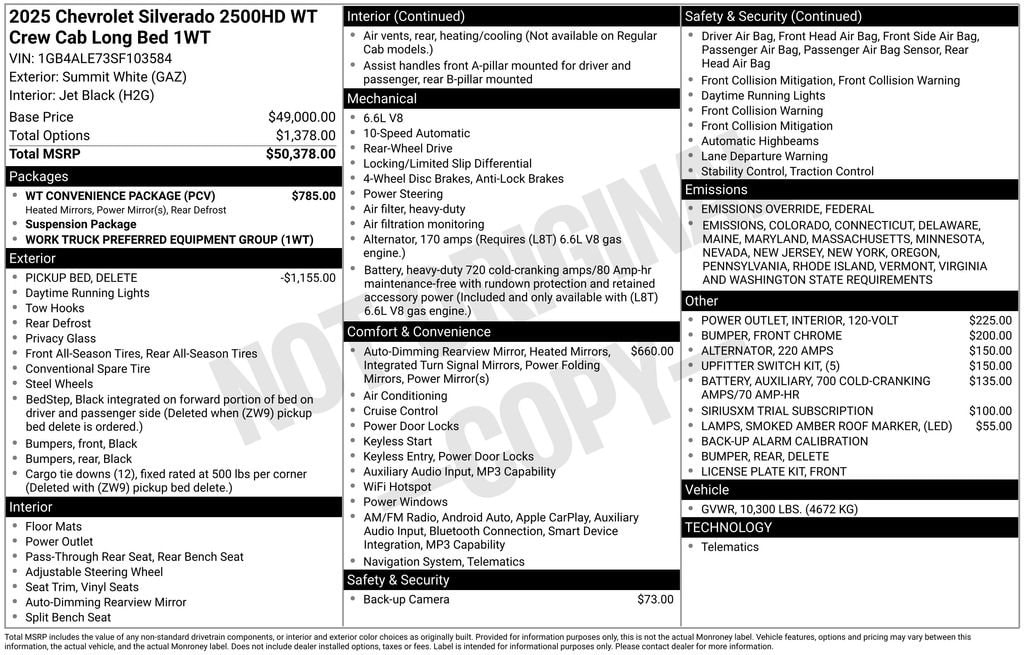 Jim Ellis Chevrolet is pumped up to offer this hard-working 2025 Chevrolet Silverado 2500HD Work Truck in Summit White Beautifully equipped with Preferred Equipment Group 1WT (170 Amp Alternator, 3.5 Diagonal Monochromatic Display DIC, Black Front Bumper, Black Mirror Caps, Black Rear Bumper, Bluetooth® For Phone, Chevrolet Connected Access Capable, Compass, Electronic Cruise Control w/Set & Resume Speed, HD Rear Vision Camera, High-Visibility Vertical Trailering Mirrors, Locking Tailgate, Manual Tailgate Function w/No EZ Lift, Manual Tilt-Wheel Steering Column, OnStar Services Capable, Power Door Locks, Power Front Windows w/Driver Express Up/Down, Power Rear Windows w/Express Down, Push Button Start, Rear 60/40 Folding Bench Seat (Folds Up), Remote Keyless Entry, Rubberized-Vinyl Floor Covering, Solar Absorbing Tinted Glass, Standard Tailgate, Wi-Fi Hotspot Capable, and Wireless Phone Projection), Suspension Package, WT Convenience Package (Deep-Tinted Glass, Electric Rear-Window Defogger, EZ Lift Power Lock & Release Tailgate, and Heated Vertical Trailering Mirrors), 10-Speed Automatic, Jet Black Vinyl, 120-Volt Interior Power Outlet, 220 Amp Alternator, 3.73 Rear Axle Ratio, 4-Wheel Disc Brakes, 6 Speakers, 6-Speaker Audio System, 700 Cold-Cranking Amps/70 Amp-hr Auxiliary Battery, 720 Cold-Cranking Amps Heavy-Duty Battery, ABS brakes, Air Conditioning, AM/FM radio, Apple CarPlay/Android Auto, Auto High-beam Headlights, Auto-Dimming Inside Rear-View Mirror, Brake assist, Chrome Front Bumper, Cruise Control, Delay-off headlights, Driver door bin, Dual front impact airbags, Dual front side impact airbags, Durabed Pickup Bed, Electronic Stability Control, Emergency communication system: OnStar, Front 40/20/40 Split-Bench Seats w/Lockable Storage, Front anti-roll bar, Front Center Armrest w/Storage, Front License Plate Kit, Front reading lights, Front wheel independent suspension, Fully automatic headlights, Heated & Auto-Dimming Vertical Trailering Mirrors, Illuminated entry, LED Smoked Amber Roof Marker Lamps, Low tire pressure warning, Occupant sensing airbag, Outside temperature display, Overhead airbag, Overhead console, Panic alarm, Passenger door bin, Passenger vanity mirror, Power steering, Power windows, Premium audio system: Chevrolet Infotainment 3, Radio: Chevrolet Infotainment 3 System, Rear reading lights, Rear step bumper, Remote keyless entry, SiriusXM Trial Subscription, Split folding rear seat, Tachometer, Tilt steering wheel, Traction control, Trip computer, Upfitter Switch Kit (5), Variably intermittent wipers, Vinyl Seat Trim, Voltmeter, and Wheels: 17 Silver Painted Steel! 10-Speed Automatic, Jet Black Vinyl.Call our internet team today @ 678-534-7320 to schedule a hassle free test drive! We are located at: 5900 Peachtree Industrial Blvd, Atlanta, GA, 30341. Price does not include Tax, Title and Dealer Fees. $1000 - Chevrolet GM Financial APR & NCC Consumer Cash Program: $1000 discount and 6.59% APR for 36 months. $30.69 per $1000 financed. Available to well qualified buyers who finance through GM Financial. XGQ, NCC. Exp. 12/01/2025