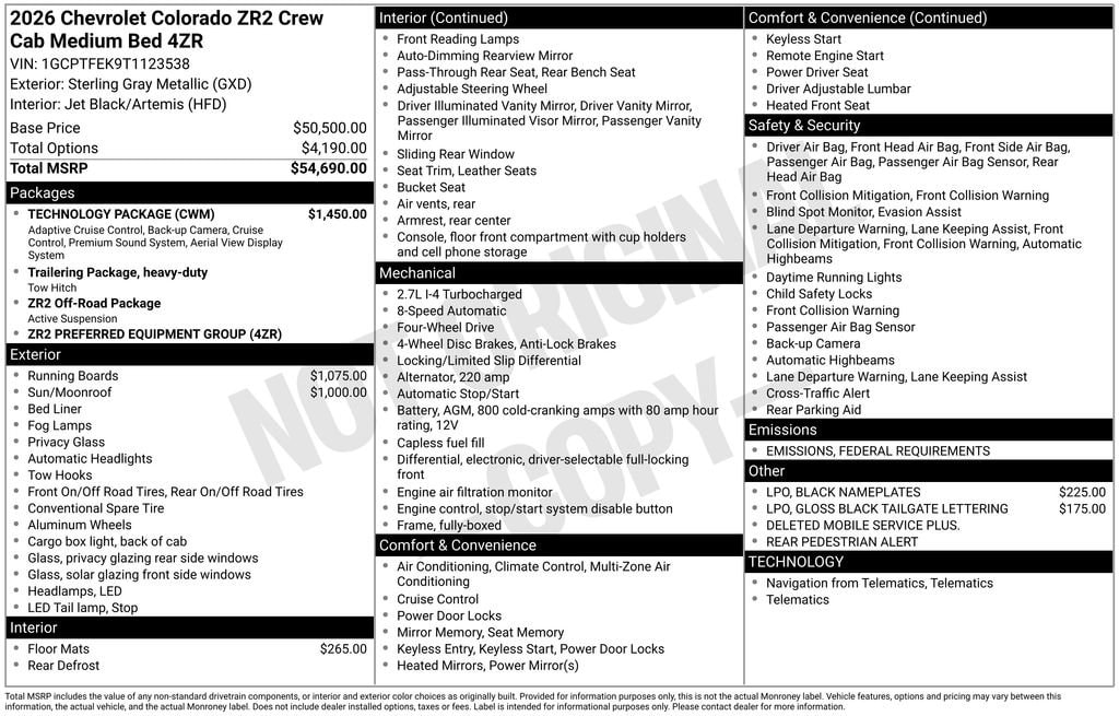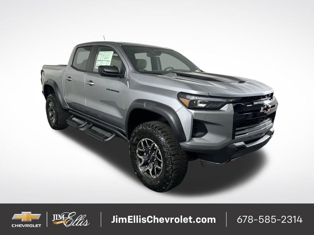 Jim Ellis Chevrolet is pumped up to offer this great 2026 Chevrolet Colorado ZR2 in Sterling Gray Metallic Beautifully equipped with Preferred Equipment Group 4ZR (Automatic Emergency Braking, Chevy Safety Assist, Following Distance Indicator, Forward Collision Alert, Front Pedestrian & Bicyclist Braking, IntelliBeam Automatic High Beam On/Off, and Lane Keep Assist w/Lane Departure Warning), Technology Package (Adaptive Cruise Control, Bose Premium 7-Speaker Audio System Feature, HD Surround Vision, and Rear Pedestrian Alert), ZR2 Off-Road Package, 4WD, 1st & 2nd Row All-Weather Floor Liner (LPO), 3.42 Rear Axle Ratio, 4-Way Manual Passenger Seat Adjuster, 4-Wheel Disc Brakes, 6 Speakers, 6-Speaker Audio System Feature, 8-Way Power Driver Seat Adjuster, ABS brakes, Air Conditioning, Alloy wheels, AM/FM radio: SiriusXM with 360L, Apple CarPlay/Android Auto, Auto High-beam Headlights, Auto-dimming Rear-View mirror, Automatic temperature control, Black Nameplates (LPO), Brake assist, Compass, Cruise Control, Delay-off headlights, Deleted Mobile Service Plus, Driver & Front Passenger Heated Seats, Driver & Front Passenger Ventilated Seats, Driver door bin, Driver Memory Settings, Driver Seatback Map Pocket, Driver vanity mirror, Dual front impact airbags, Dual front side impact airbags, Electronic Stability Control, Emergency communication system: OnStar, Front anti-roll bar, Front Bucket Seats, Front Center Armrest, Front dual zone A/C, Front fog lights, Front Passenger Seatback Map Pocket, Front reading lights, Front wheel independent suspension, Gloss Black Tailgate Lettering (LPO), Heated door mirrors, Heated front seats, Heated steering wheel, Illuminated entry, Low tire pressure warning, Memory seat, Navigation System, Occupant sensing airbag, Outside temperature display, Overhead airbag, Overhead console, Panic alarm, Passenger door bin, Passenger vanity mirror, Perforated Leather-Appointed Seat Trim, Power door mirrors, Power Driver Lumbar Control Seat Adjuster, Power driver seat, Power Sliding Glass w/Manual Shade Sunroof, Power steering, Power windows, Radio data system, Radio: 11.3 Diagonal Advanced Color LCD Display, Rear reading lights, Rear seat center armrest, Rear step bumper, Rear window defroster, Remote keyless entry, Removable Front & Rear Off-Road Assist Steps (LPO), Security system, SiriusXM w/360L Trial Subscription, Speed-sensing steering, Split folding rear seat, Steering Wheel Mounted Audio Controls, Steering wheel mounted audio controls, Tachometer, Telescoping steering wheel, Tilt steering wheel, Traction control, Trip computer, Variably intermittent wipers, Ventilated front seats, Wheels: 17 x 8 Graphite & Oxide Gold Aluminum, and Wireless Phone Projection! 4WD.