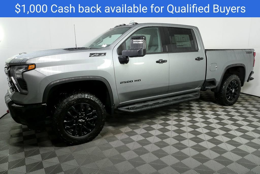Jim Ellis Chevrolet is proud to offer this hard-working 2026 Chevrolet Silverado 2500HD LTZ in Sterling Gray Metallic Beautifully equipped with Gooseneck/5th Wheel Prep Package (Black Chevytec Spray-on Bedliner), LTZ Convenience Package (2 Charge/Data USB Ports Inside Center Console, BOSE Premium 7-Speaker Sound System, Floor-Mounted Center Console, Front Bucket Seats, LED Cargo Area Lighting, Ventilated Driver and Front Passenger Seats, and Wireless Charging), LTZ Convenience Package II (Adaptive Cruise Control, Heated 2nd Row Outboard Seats, Power Sliding Rear Window with Defogger, and Universal Home Remote), LTZ Plus Package, Safety Package (Bed View Camera with Two Trailer Camera Provisions, HD Surround Vision, Rear Cross Traffic Alert, Safety Alert Seat, Trailer Camera Provisions, Trailer Side Blind Zone Alert, and Ultrasonic Front and Rear Park Assist), Suspension Package, Technology Package (15 Diagonal Multicolor Head-Up Display and Rear Camera Mirror), Trail Boss Package (Black Grille Bar with Chevy Black Bow Tie, Front Frame-Mounted Red Recovery Hooks, High Gloss Black Door Handles, High Gloss Black Mirror Caps, and Wheels: 20 High Gloss Black Painted), Up-Level Rear Seat with Storage Package, Z71 Off-Road Package (Hill Descent Control and Off-Road Suspension), 10-Speed Automatic, 4WD, Jet Black Leather, 10-Way Power Driver Seat Adjuster with Lumbar, 10-Way Power Passenger Seat Adjuster with Lumbar, 120-Volt Bed Mounted Power Outlet, 120-Volt Interior Power Outlet, 170 Amp Alternator, 1st and 2nd Row All-Weather Floor Liners, 3.73 Rear Axle Ratio, 3 Round Black Tubular Off-Road Assist Steps, 4-Wheel Disc Brakes, 6 Speakers, 6-Speaker Audio System, 720 Cold-Cranking Amps Heavy-Duty Battery, ABS brakes, Air Conditioning, Alloy wheels, AM/FM radio: SiriusXM with 360L, Apple CarPlay/Android Auto, Auto High-beam Headlights, Auto-dimming door mirrors, Auto-Dimming Inside Rear-View Mirror, Auto-dimming Rear-View mirror, Automatic temperature control, Bluetooth® For Phone, Body-Color Front Bumper, Body-Color Rear Bumper, Brake assist, Bumpers: chrome, Chevrolet Connected Access Capable, Chrome Door Handles, Chrome Mirror Caps, Color-Keyed Carpeting Floor Covering, Compass, Cruise Control, Deep-Tinted Glass, Delay-off headlights, Driver door bin, Driver Memory, Driver vanity mirror, Dual front impact airbags, Dual front side impact airbags, Durabed Pickup Bed, Electric Rear-Window Defogger, Electronic Cruise Control with Set and Resume Speed, Electronic Stability Control, Emergency communication system: OnStar, EZ Lift Power Lock and Release Tailgate, Front 40/20/40 Split-Bench Seats with Lockable Storage, Front anti-roll bar, Front Center Armrest w/Storage, Front dual zone A/C, Front fog lights, Front LED Fog Lamps, Front Rain-Sensing Wipers, Front reading lights, Front Rubberized Vinyl Floor Mats, Front wheel independent suspension, Fully automatic headlights, HD Rear Vision Camera, Heated door mirrors, Heated Driver and Front Outboard Passenger Seating, Heated front seats, Heated Steering Wheel, Heated steering wheel, Hitch Guidance with Hitch View, Illuminated entry, in-Vehicle Trailering App System, Keyless Open and Start, LED Smoked Amber Roof Marker Lamps, Low tire pressure warning, Manual Tilt and Telescoping Steering Column, Memory seat, Multi-Flex Tailgate, Occupant sensing airbag, OnStar Services Capable, Outside temperature display, Overhead airbag, Overhead console, Panic alarm, Passenger door bin, Passenger vanity mirror, Perforated Leather-Appointed Front Outboard Seat Trim, Power Door Locks, Power door mirrors, Power driver seat, Power Front Windows with Driver Express Up/Down, Power Front Windows with Passenger Express Up/Down Price does not include Tax, Title and Dealer Fees. $1000 - Chevrolet GM Financial APR & NCC Consumer Cash Program: $1000 discount and 6.69% APR for 36 months. $30.74 per $1000 financed. Available to well qualified buyers who finance through GM Financial. XGQ, NCC. Exp. 01/02/2026