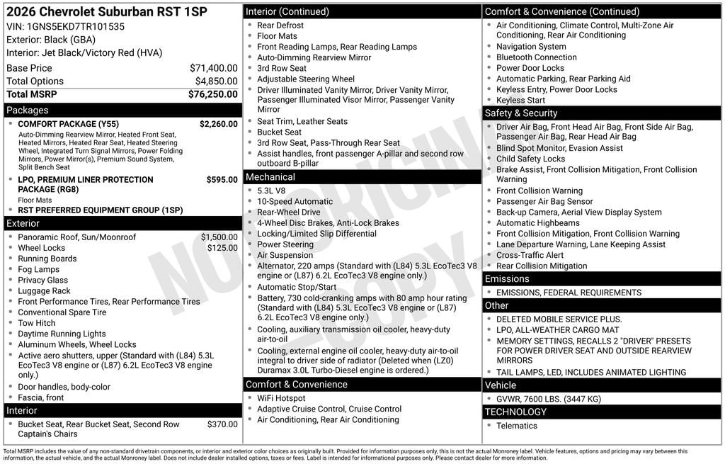 Jim Ellis Chevrolet is honored to offer this superb-looking 2026 Chevrolet Suburban RST in Black Beautifully equipped with Comfort Package (2nd Row Pwr Release 60/40 Split-Folding Bench Seat, 3rd Row 60/40 Power-Folding Split-Bench, Bose 10-Speaker Surround w/CenterPoint, Heated 2nd Row Outboard Seats, Heated Power-Adjustable Outside Mirrors, Heated Steering Wheel, LED Headlamps w/LED Daytime Running Lamps, LED Tail Lamps, and Memory Settings), Preferred Equipment Group 1SP (8-Way Power Front Passenger Seat Adjuster, Auto-Dimming Inside Rear-View Mirror, Bright Front & Rear Door Sill Plates, Dual Exhaust System, Front LED Fog Lamps, Heated Driver & Front Passenger Seats, Interior Camera, Memory Settings For Driver, Rear Power Liftgate, RST Exterior Features, Universal Home Remote, and Wireless Phone Charging), Premium Liner Protection Package (LPO) (1st & 2nd Rows Premium Floor Liners (LPO), 3rd Row All-Weather Floor Liners (LPO), and All-Weather Cargo Mat (LPO)), 2-Way Driver Power Lumbar Seat Adjuster, 2-Way Front Passenger Power Lumbar Seat Adjuster, 3.23 Rear Axle Ratio, 3rd row seats: split-bench, 4-Wheel Disc Brakes, 6 Speakers, 6-Speaker Audio System, 8-Way Power Driver Seat Adjuster, ABS brakes, Air Conditioning, Alloy wheels, AM/FM radio: SiriusXM with 360L, Apple CarPlay/Android Auto, Auto High-beam Headlights, Auto-dimming Rear-View mirror, Automatic temperature control, Brake assist, Bumpers: body-color, Compass, Cruise Control, Delay-off headlights, Deleted Mobile Service Plus, Driver door bin, Driver vanity mirror, Dual front impact airbags, Dual front side impact airbags, Dual-Pane Power Panoramic Sunroof, Electronic Stability Control, Emergency communication system: OnStar Services capable, Exterior Parking Camera Rear, Four wheel independent suspension, Front anti-roll bar, Front Bucket Seats, Front Center Armrest, Front dual zone A/C, Front fog lights, Front reading lights, Fully automatic headlights, Garage door transmitter, Heated door mirrors, Heated front seats, Illuminated entry, Low tire pressure warning, Memory seat, Navigation system: Google built-in compatibility (select service plan required, terms and limitations apply), Occupant sensing airbag, Outside temperature display, Overhead airbag, Overhead console, Panic alarm, Passenger door bin, Passenger vanity mirror, Perforated Leather Seating Surfaces, Power door mirrors, Power driver seat, Power Liftgate, Power passenger seat, Power Release 2nd Row Bucket Seats, Power steering, Power windows, Premium Smooth Ride Suspension, Radio data system, Radio: 17.7 Diagonal Advanced Color LCD Display, Rain sensing wipers, Rear air conditioning, Rear anti-roll bar, Rear reading lights, Rear seat center armrest, Rear window defroster, Rear window wiper, Remote keyless entry, Security system, SiriusXM w/360L Trial Subscription, Speed-sensing steering, Split folding rear seat, Spoiler, Steering wheel mounted audio controls, Tachometer, Telescoping steering wheel, Tilt steering wheel, Traction control, Trip computer, Variably intermittent wipers, Voltmeter, Wheel Locks (Set of 4) (LPO), Wheels: 22 x 9 Bright Machined, and Wireless Apple CarPlay/Wireless Android Auto!Call our internet team today @ 678-534-7320 to schedule a hassle free test drive! We are located at: 5900 Peachtree Industrial Blvd, Atlanta, GA, 30341.