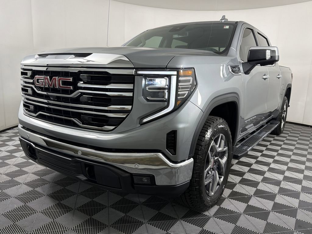 Sterling Metallic 2026 GMC Sierra 1500 SLT 4WD 10-Speed Automatic EcoTec3 5.3L V8 10-Speed Automatic, 4WD, Black Leather.