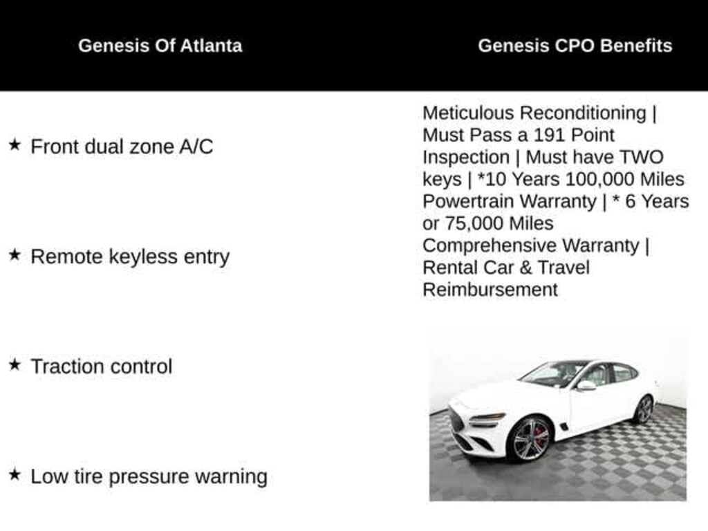 Navigation, Back-Up Camera, Turbocharged, Onboard Communications System, Keyless Start, Dual Zone A/C, Smart Device Integration, Cross-Traffic Alert, Lane Keeping Assist, Blind Spot Monitor. Remote Trunk Release, Keyless Entry, Child Safety Locks, Electronic Stability Control. Retired Loaner Genesis 2.5T with Uyuni White exterior and Fog Gray Two-Tone interior features a 4 Cylinder Engine with 300 HP at 5800 RPM*.