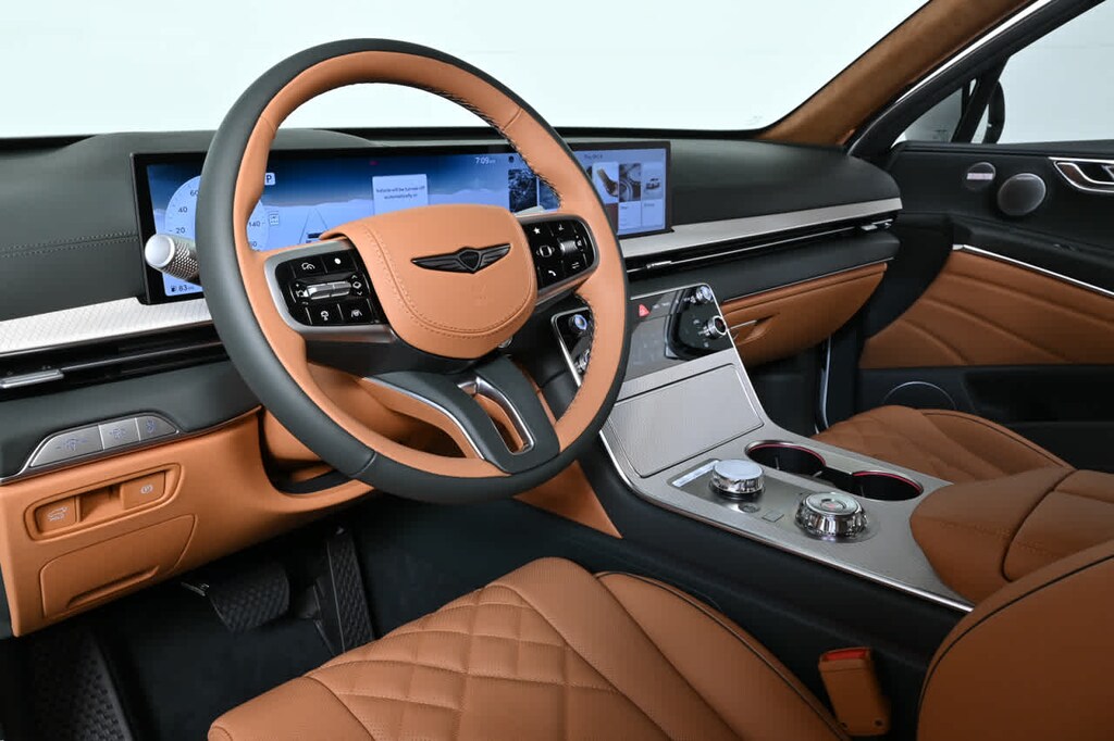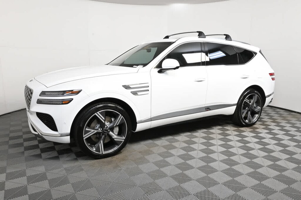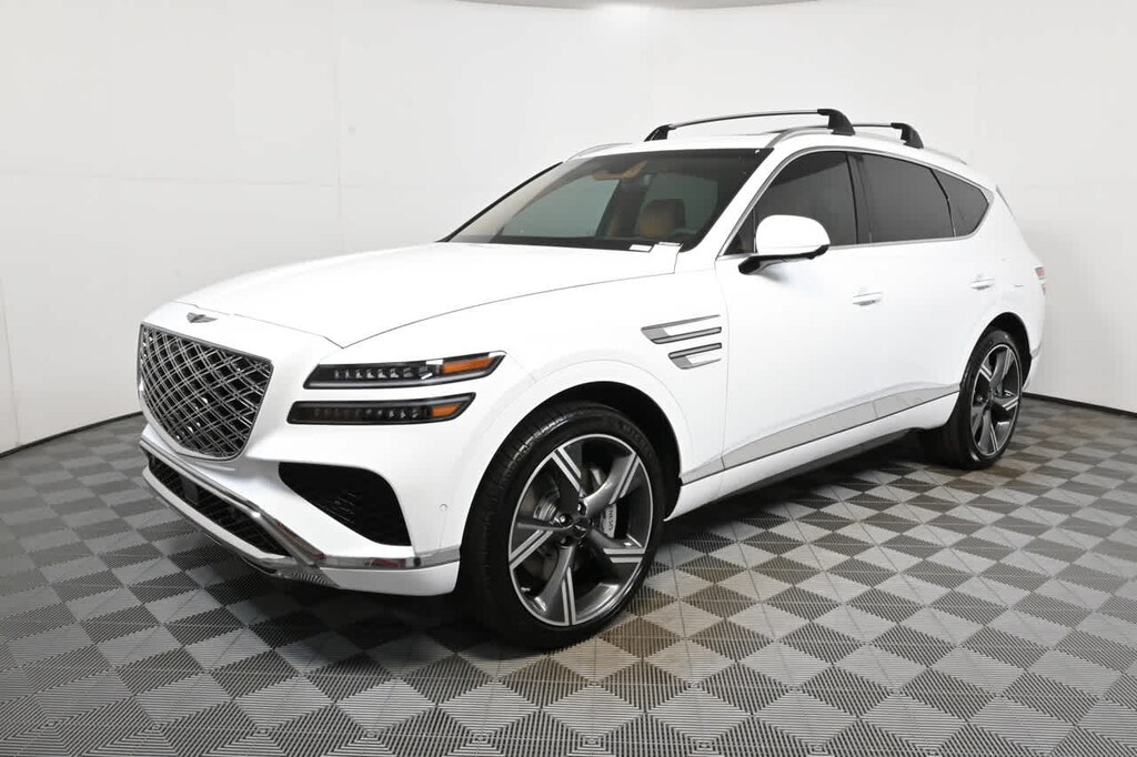 Leather Seats, Third Row Seat, Navigation, All Wheel Drive, Power Liftgate, Rear Air, Heated Driver Seat, Heated Rear Seat, Cooled Driver Seat, Cooled Rear Seat Rear Spoiler, MP3 Player, Keyless Entry, Privacy Glass. Genesis Prestige with Alta White exterior and Earth Brown/Smoky Green interior features a V6 Cylinder Engine with 375 HP at 5800 RPM*.
