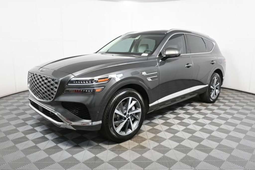 This 2026 Genesis GV80 is equipped with Option Group 01, 18 Speakers, 3rd row seats: split-bench, 4-Wheel Disc Brakes, ABS brakes, Adaptive suspension, Air Conditioning, Alloy wheels, AM/FM radio: SiriusXM, Anti-whiplash front head restraints, Auto High-beam Headlights, Auto tilt-away steering wheel, Auto-dimming door mirrors, Auto-dimming Rear-View mirror, Automatic temperature control, Brake assist, Bumpers: body-color, Compass, Delay-off headlights, Driver door bin, Driver vanity mirror, Dual front impact airbags, Dual front side impact airbags, Electronic Stability Control, Emergency communication system: Genesis Connected Services, Exterior Parking Camera Rear, Four wheel independent suspension, Fragrance Cartridge, Front anti-roll bar, Front Bucket Seats, Front Center Armrest, Front dual zone A/C, Front reading lights, Fully automatic headlights, Garage door transmitter: HomeLink, Genuine wood console insert, Genuine wood dashboard insert, Genuine wood door panel insert, Heads-Up Display, Heated door mirrors, Heated front seats, Heated rear seats, Heated steering wheel, Illuminated entry, Knee airbag, Leather Seating Surfaces, Leather steering wheel, Low tire pressure warning, Memory seat, Navigation System, Occupant sensing airbag, Outside temperature display, Overhead airbag, Overhead console, Panic alarm, Passenger door bin, Passenger vanity mirror, Power door mirrors, Power driver seat, Power Liftgate, Power moonroof, Power passenger seat, Power steering, Power windows, Radio data system, Radio: AM/FM/SiriusXM/HD Bang & Olufsen Sound Sys, Rain sensing wipers, Rear air conditioning, Rear anti-roll bar, Rear dual zone A/C, Rear reading lights, Rear seat center armrest, Rear side impact airbag, Rear window defroster, Rear window wiper, Reclining 3rd row seat, Remote keyless entry, Security system, Speed control, Speed-sensing steering, Speed-Sensitive Wipers, Split folding rear seat, Spoiler, Steering wheel memory, Steering wheel mounted audio controls, Tachometer, Telescoping steering wheel, Tilt steering wheel, Traction control, Trip computer, Turn signal indicator mirrors, Variably intermittent wipers, Ventilated Front AND Rear Seats, Ventilated front seats, and Wheels: 20" x 8.5J Dark Gray Matte Alloy.