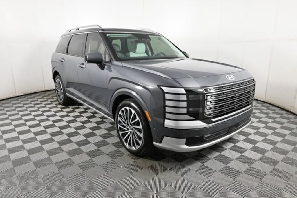This 2026 Hyundai Palisade is equipped with Option Group 01, 14 Speakers, 3rd row seats: split-bench, 4-Wheel Disc Brakes, ABS brakes, Air Conditioning, Alloy wheels, AM/FM radio: SiriusXM, Apple CarPlay & Android Auto, Audio memory, Auto High-beam Headlights, Auto-dimming door mirrors, Auto-dimming Rear-View mirror, Auto-leveling suspension, Automatic temperature control, Brake assist, Bumpers: body-color, Cargo Cover, Cargo Net, Cargo Tray, Carpeted Floor Mats, Compass, Delay-off headlights, Driver door bin, Driver vanity mirror, Dual front impact airbags, Dual front side impact airbags, Electronic Stability Control, Emergency communication system: Bluelink+, Exterior Parking Camera Rear, First Aid Kit, Four wheel independent suspension, Front anti-roll bar, Front Bucket Seats, Front Center Armrest, Front dual zone A/C, Front reading lights, Fully automatic headlights, Garage door transmitter: HomeLink, Genuine wood console insert, Genuine wood dashboard insert, Heads-Up Display, Heated door mirrors, Heated front seats, Heated rear seats, Heated steering wheel, HVAC memory, Illuminated entry, Knee airbag, Leather steering wheel, Low tire pressure warning, Memory seat, Navigation System, Occupant sensing airbag, Outside temperature display, Overhead airbag, Overhead console, Panic alarm, Passenger door bin, Passenger vanity mirror, Power door mirrors, Power driver seat, Power Liftgate, Power moonroof, Power passenger seat, Power steering, Power windows, Premium Nappa Leather Seat Trim, Radio data system, Radio: Infotainment Navigation System, Rain sensing wipers, Rear air conditioning, Rear anti-roll bar, Rear audio controls, Rear reading lights, Rear side impact airbag, Rear window defroster, Rear window wiper, Reclining 3rd row seat, Remote keyless entry, Security system, Speed control, Split folding rear seat, Spoiler, Steering wheel mounted audio controls, Tachometer, Telescoping steering wheel, Tilt steering wheel, Traction control, Trip computer, Turn signal indicator mirrors, Variably intermittent wipers, Ventilated Front AND Rear Seats, Ventilated front seats, Ventilated rear seats, and Wheels: 21" x 8.5J Alloy. Not all rebates are compatible with all finance programs. Please see dealer for details and final price. $1250 - Hyundai HMF Dealer Choice : $1250 discount and 5.99% APR for 24 months. $44.32 per $1000 financed. Available to well qualified buyers who finance through Hyundai Motor Finance. H704. Exp. 11/03/2025