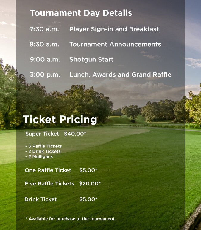 Please note that we have reached full capacity for player registration. Any additional player registrations will be placed on our waitlist and will be notified if openings become available leading up to the tournament. Although player registration is full, we do invite you to support our charity golf tournament in other ways, including sponsorships, cash donations, and raffle/auction item donations.