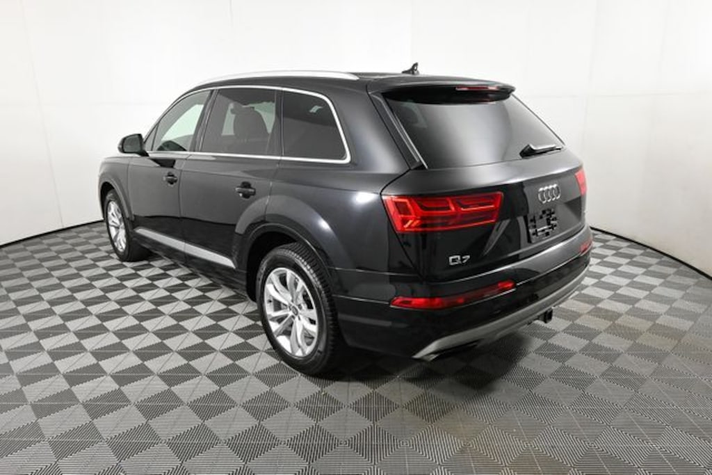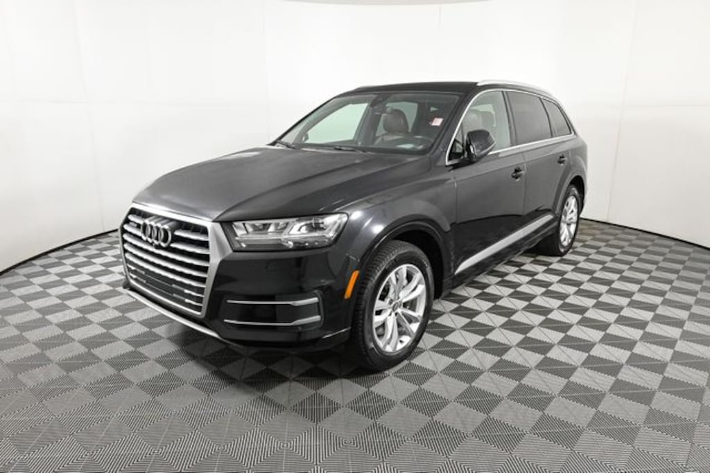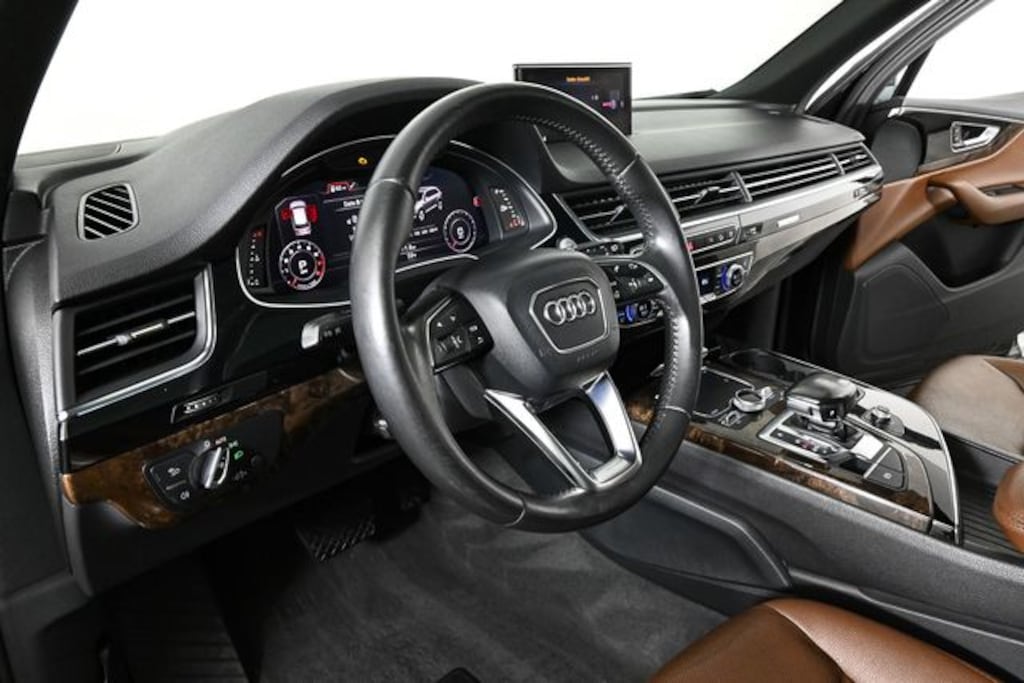 This 2017 Audi Q7 is equipped with Q7 3.0 TDI Premium Plus quattro, 4D Sport Utility, 3.0L V6 TDI DOHC, quattro, Orca Black Metallic, Nougat Brown w/Leather Seating Surfaces, 10 Speakers, 2.848 Axle Ratio, 3rd row seats: bench, 4-Wheel Disc Brakes, ABS brakes, Air Conditioning, Alloy wheels, AM/FM radio: SiriusXM, Auto tilt-away steering wheel, Auto-dimming door mirrors, Auto-dimming Rear-View mirror, Automatic temperature control, Brake assist, Bumpers: body-color, CD player, Compass, Delay-off headlights, Driver door bin, Driver vanity mirror, Driver's Seat Mounted Armrest, Dual front impact airbags, Dual front side impact airbags, Electronic Stability Control, Emergency communication system: Audi connect, Exterior Parking Camera Rear, Four wheel independent suspension, Front anti-roll bar, Front Bucket Seats, Front dual zone A/C, Front fog lights, Front reading lights, Fully automatic headlights, Garage door transmitter: HomeLink, Heated door mirrors, Heated Front Bucket Seats, Heated front seats, High intensity discharge headlights: Xenon plus, Illuminated entry, Leather Seating Surfaces, Leather Shift Knob, Leather steering wheel, Low tire pressure warning, Memory seat, Navigation System, Occupant sensing airbag, Outside temperature display, Overhead airbag, Panic alarm, Passenger door bin, Passenger seat mounted armrest, Passenger vanity mirror, Power door mirrors, Power driver seat, Power Liftgate, Power moonroof, Power passenger seat, Power steering, Power windows, Radio data system, Radio: MMI Navigation Plus w/Voice Control, Rain sensing wipers, Rear air conditioning, Rear anti-roll bar, Rear fog lights, Rear reading lights, Rear seat center armrest, Rear window defroster, Rear window wiper, Remote keyless entry, Roof rack: rails only, Security system, Speed control, Speed-sensing steering, Split folding rear seat, Spoiler, Steering wheel memory, Steering wheel mounted audio controls, Tachometer, Telescoping steering wheel, Tilt steering wheel, Traction control, Trip computer, Turn signal indicator mirrors, Variably intermittent wipers, and Wheels: 19" 5-V-Spoke Design.