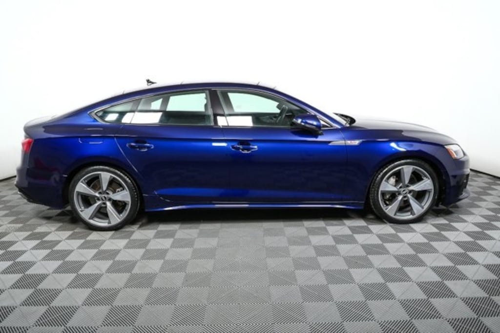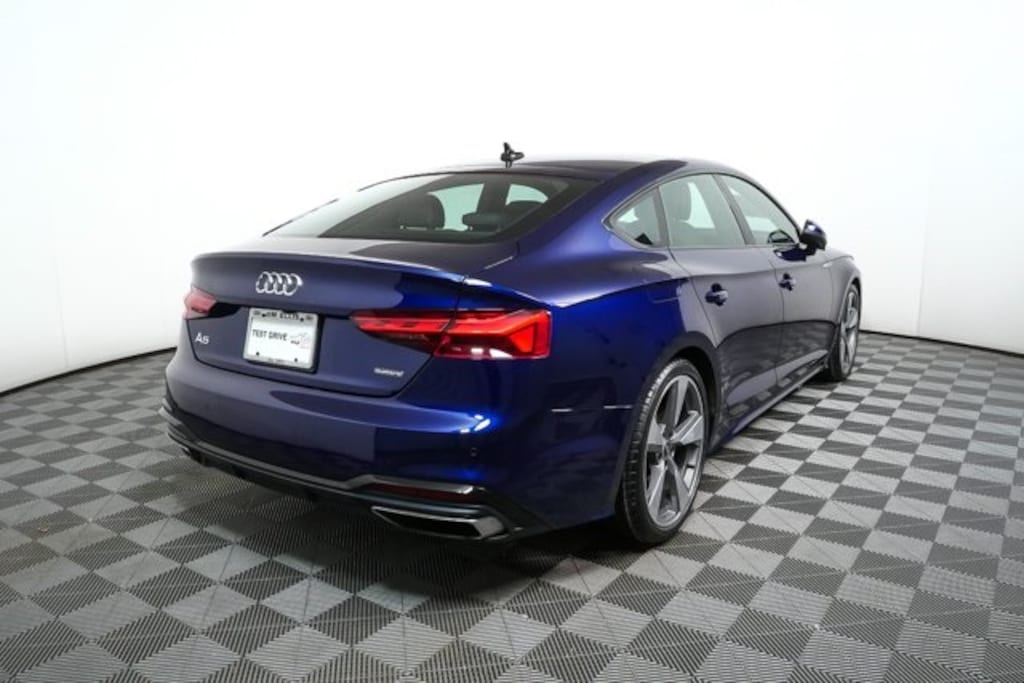 The 2021 Audi A5 Sportback S line 45 TFSI quattro in Navarra Blue Metallic with Black leather and Rock Gray stitching blends sporty elegance with advanced technology. It features a 2.0 TFSI engine with 7��'speed S tronic transmission and quattro all-wheel drive, Matrix-design LED headlights, and a panoramic sunroof. Inside, the cabin includes heated 8-way power front sport seats with lumbar adjustment, Audi virtual cockpit, Bang & Olufsen 3D sound system, and three-zone automatic climate control. Safety is comprehensive with Audi pre sense, lane departure warning, and rearview camera, while convenience is enhanced with adaptive cruise with Traffic Jam assist, top view camera system, and Audi side assist with pre sense rear.