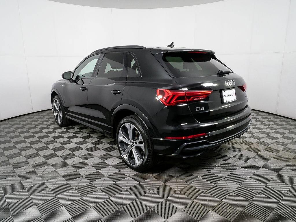 This 2021 Audi Q3 S line 45 TFSI quattro is finished in Mythos Black Metallic over a Black interior and powered by a turbocharged 2.0L engine paired with an 8-speed Tiptronic transmission and quattro all-wheel drive.