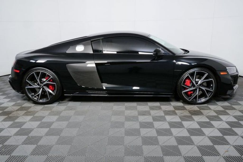 The 2022 Audi R8 V10 performance Coupe RWD in Mythos Black Metallic with Express Red leather delivers pure supercar drama with a naturally aspirated V10, rear-wheel-drive balance, and a track-focused edge wrapped in unmistakable Audi design. With carbon fiber accents, laser lighting, and a cockpit built around performance, this R8 blends precision engineering with unmistakable presence.