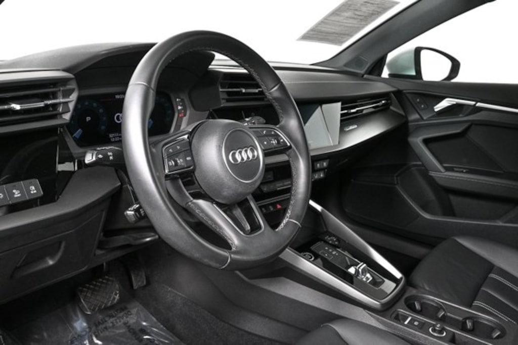 The 2023 Audi A3 40 TFSI quattro in Glacier White Metallic with a Black leather interior blends sporty elegance and refined performance. Powered by a 2.0L turbocharged engine and a 7-speed S tronic transmission with quattro all-wheel drive, it delivers agile handling and confident traction. Its Black optic sport package enhances its athletic character with striking black exterior elements and 18-inch bi-color 5-Y-spoke wheels, while the interior offers advanced technology, comfort, and safety in classic Audi fashion.
