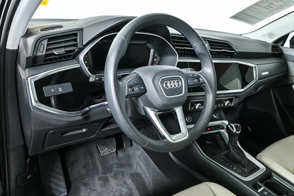 The 2023 Audi Q3 S Line 45 TFSI Quattro delivers confident all-weather performance and refined style in a compact luxury SUV package. Dressed in Mythos Black Metallic with a Pearl Beige interior, this Q3 pairs bold design with sophisticated comfort. Its turbocharged 2.0L engine and Quattro all-wheel drive system provide responsive power, while the Premium Plus package adds advanced technology, convenience, and driver assistance features.
