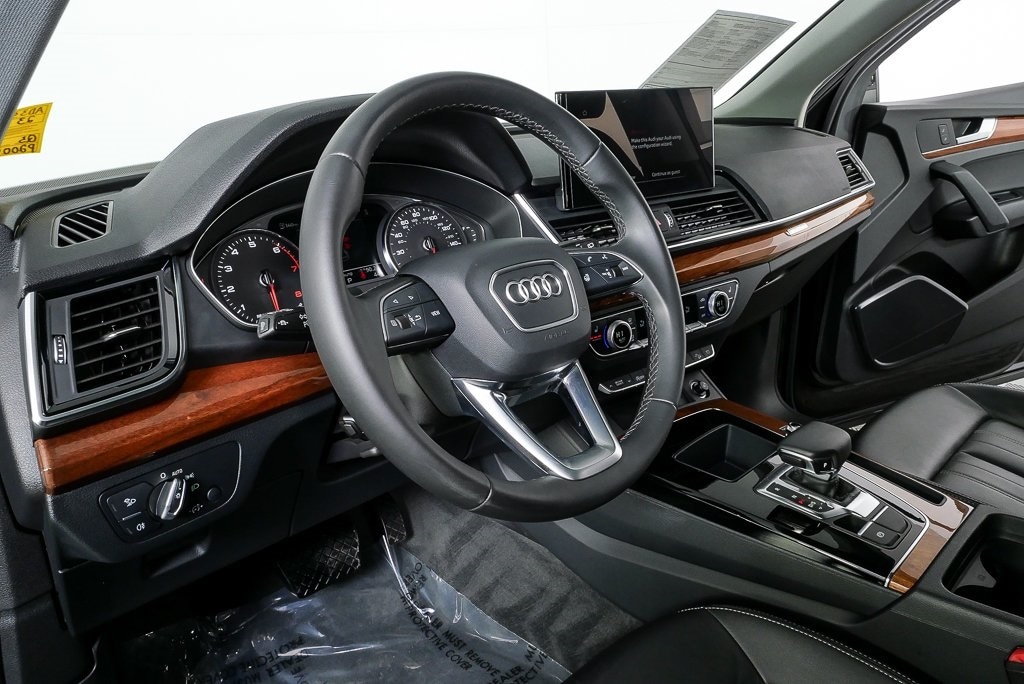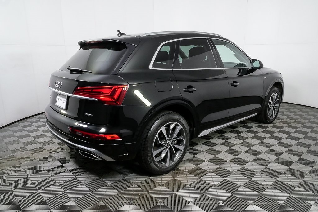 The 2023 Audi Q5 S line 45 TFSI quattro in Mythos Black Metallic pairs its turbocharged powertrain with quattro all-wheel drive and an upscale cabin finished in Black leather with Rock Gray stitching. With added comfort, convenience, and style packages, it delivers a well-equipped and premium small-SUV driving experience.