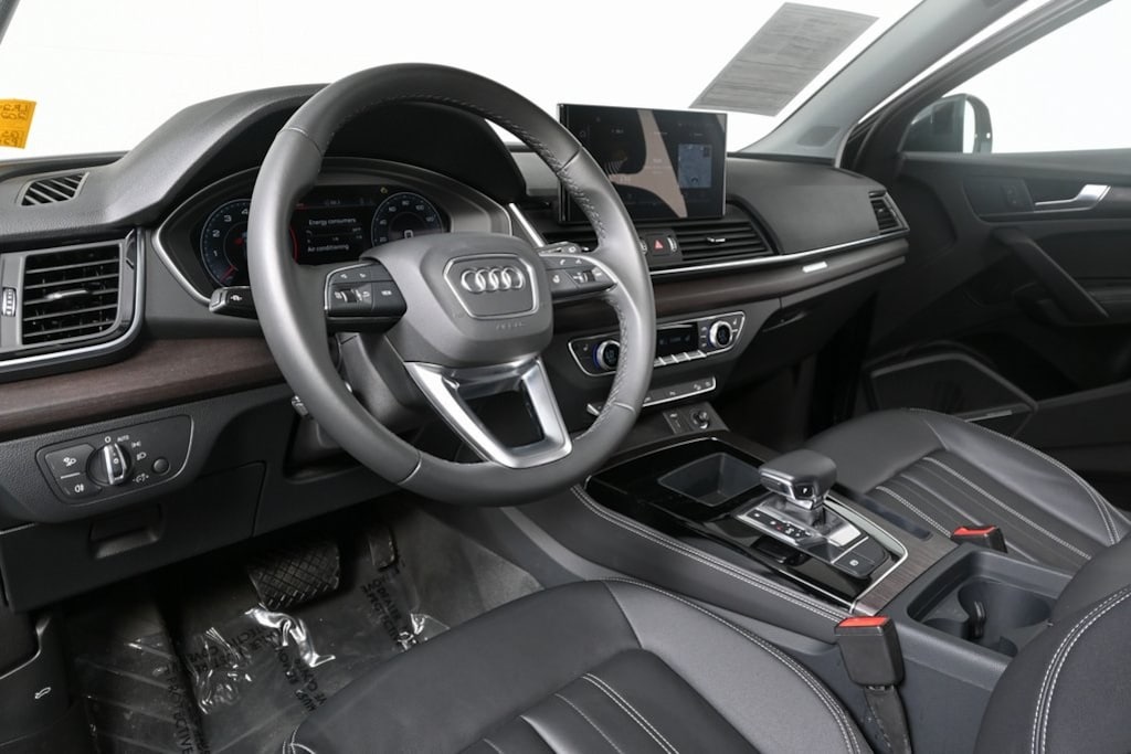 The 2023 Audi Q5 40 TFSI quattro in Manhattan Gray Metallic with a Black interior featuring Rock Gray stitching blends refined style with everyday versatility. Equipped with a turbocharged 2.0L TFSI engine paired to a 7-speed S tronic® dual-clutch transmission and quattro® all-wheel drive, it delivers both efficiency and confident traction. The Premium Plus package adds luxury features like the Bang & Olufsen® 3D sound system, top view camera, heated steering wheel, and Audi virtual cockpit. With seating finished in fine leather, a panoramic sunroof, and advanced driver-assist technology, this compact luxury SUV strikes a balance between elegance, performance, and practicality.