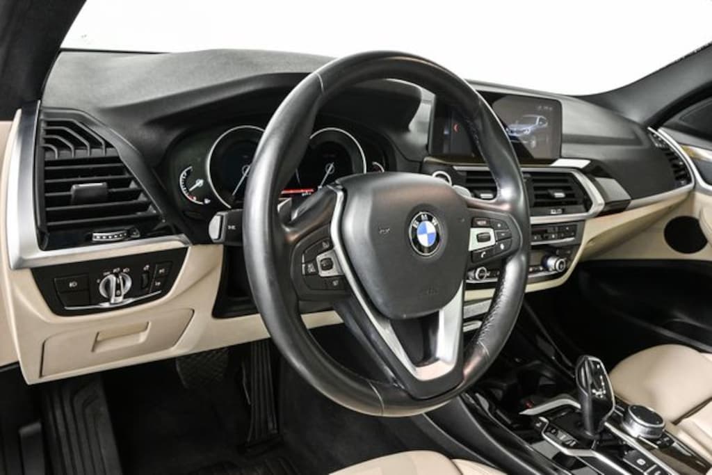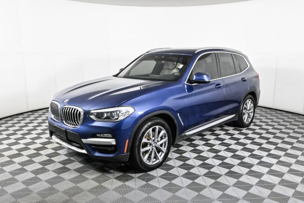 This 2019 BMW X3 is equipped with Convenience Package (LED Headlights w/Cornering Lights, Lumbar Support, Panoramic Moonroof, and SiriusXM Satellite Radio), Driving Assistance Package (Active Blind Spot Detection, Active Driving Assistant, and Lane Departure Warning System), X3 sDrive30i w/Convenience Package, 4D Sport Utility, 2.0L I4 TwinPower Turbo, RWD, Phytonic Blue Metallic, Oyster w/Contrast Stitching/Piping w/Vernasca Leather Upholstery, 12 Speakers, 3.39 Axle Ratio, 4-Wheel Disc Brakes, ABS brakes, Advanced Real-Time Traffic Information, Air Conditioning, Alloy wheels, AM/FM radio, Ambient Lighting, Apple CarPlay Compatibility, Auto-dimming door mirrors, Auto-dimming Rear-View mirror, Automatic temperature control, Brake assist, Bumpers: body-color, Comfort Access Keyless Entry, Delay-off headlights, Driver door bin, Driver vanity mirror, Dual front impact airbags, Dual front side impact airbags, Electronic Stability Control, Emergency communication system: BMW Assist eCall, Exterior Parking Camera Rear, Four wheel independent suspension, Front anti-roll bar, Front Bucket Seats, Front Center Armrest, Front dual zone A/C, Front fog lights, Front reading lights, Fully automatic headlights, Garage door transmitter, Genuine wood dashboard insert, Genuine wood door panel insert, Hands-Free Bluetooth & USB Audio Connection, Heated door mirrors, Heated Front Seats, Hi-Fi Sound System, Illuminated entry, Knee airbag, Low tire pressure warning, Memory seat, Navigation System, Occupant sensing airbag, Outside temperature display, Overhead airbag, Panic alarm, Passenger door bin, Passenger vanity mirror, Power door mirrors, Power driver seat, Power Front Seats, Power Liftgate, Power passenger seat, Power steering, Power windows, Radio data system, Radio: AM/FM Stereo w/HD, Rain sensing wipers, Rear air conditioning, Rear anti-roll bar, Rear reading lights, Rear seat center armrest, Rear window defroster, Rear window wiper, Remote keyless entry, Remote Services, Roof rack: rails only, Security system, SensaTec Upholstery, Speed control, Speed-sensing steering, Speed-Sensitive Wipers, Split folding rear seat, Spoiler, Sport Bucket Seats, Sport Leather Steering Wheel, Sport steering wheel, Steering wheel mounted audio controls, Tachometer, Telescoping steering wheel, Tilt steering wheel, Traction control, Trip computer, Turn signal indicator mirrors, Variably intermittent wipers, Wheels: 18" x 7.0" Y-Spoke (Style 688), and Wheels: 19" x 7.5" V-Spoke (Style 692).
