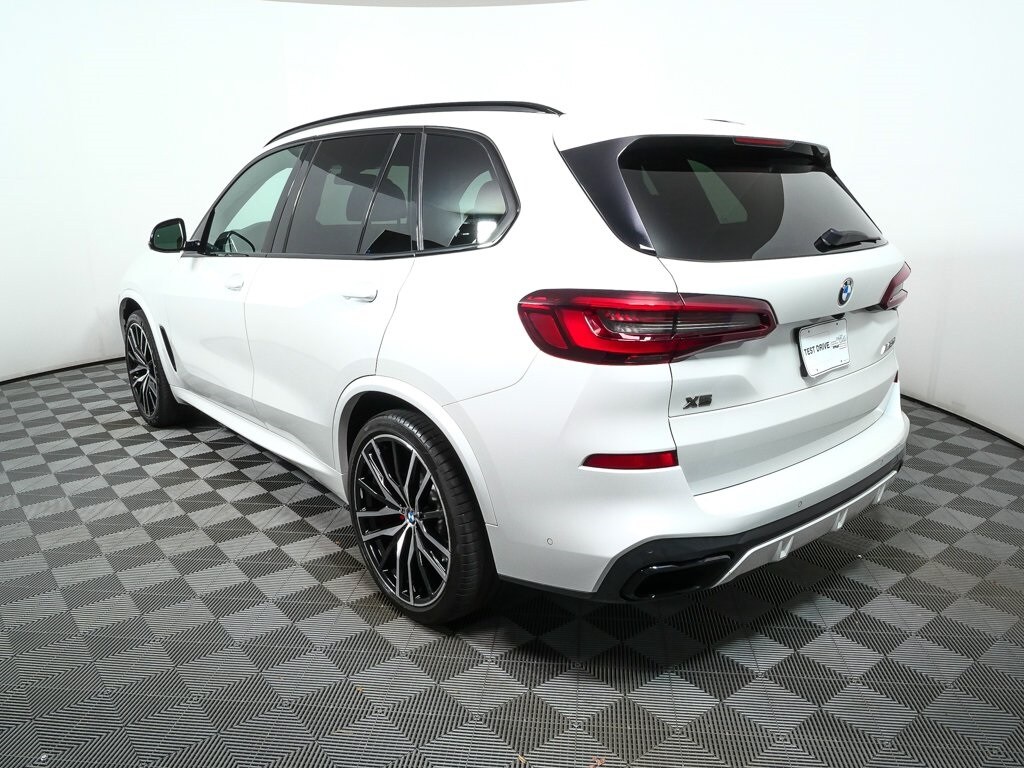 This vehicle is equipped with 22" M Double Spoke bi-color wheels with performance tires, a space-saver spare, and an increased top-speed limiter. The exterior is finished in Mineral White Metallic, paired with Tartufo extended Merino leather upholstery and Carbon Fiber interior trim. Packages include the Parking Assistance Package, Climate Comfort Package, and Executive Package. Additional features include M Sport Brakes with red calipers, rear manual side window shades, Extended Shadowline exterior trim, heated front seats with heated armrests and steering wheel, and glass interior controls.