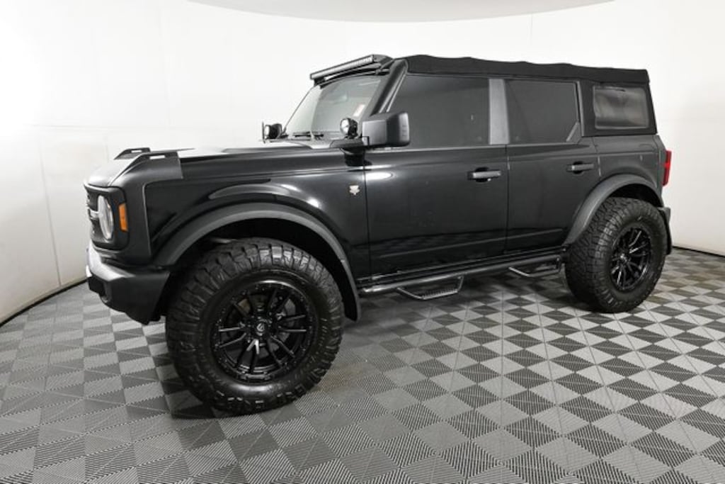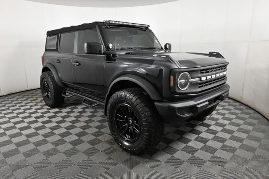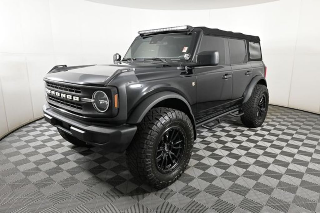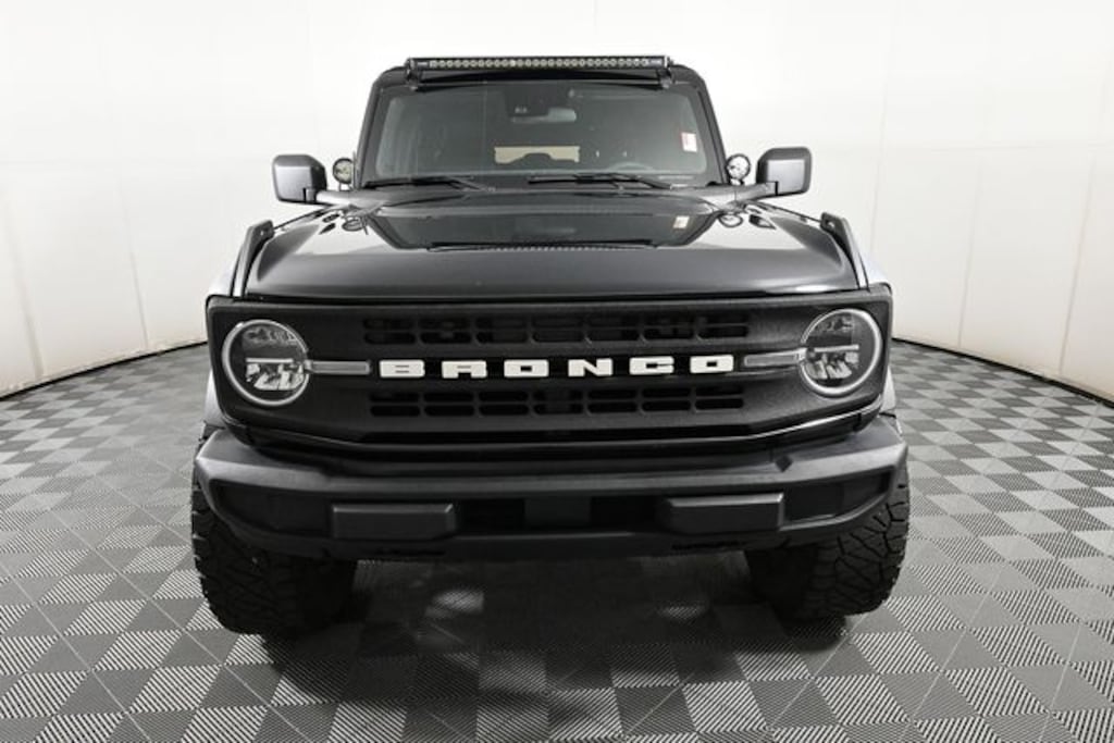 This 2022 Ford Bronco is equipped with 4D Sport Utility, 2.3L EcoBoost I-4, 4WD, Shadow Black, Dark Space Gray w/Black Onyx w/Cloth Bucket Seats, 4-Wheel Disc Brakes, 6 Speakers, ABS brakes, Air Conditioning, AM/FM radio: SiriusXM with 360L, AM/FM Stereo, Auto High-beam Headlights, Brake assist, Compass, Delay-off headlights, Driver door bin, Driver vanity mirror, Dual front impact airbags, Dual front side impact airbags, Electronic Stability Control, Emergency communication system: 911 Assist, Exterior Parking Camera Rear, Front anti-roll bar, Front Bucket Seats, Front Center Armrest, Front reading lights, Front wheel independent suspension, Fully automatic headlights, Heated door mirrors, Illuminated entry, Integrated roll-over protection, Low tire pressure warning, Occupant sensing airbag, Outside temperature display, Overhead airbag, Overhead console, Panic alarm, Passenger door bin, Passenger vanity mirror, Power door mirrors, Power steering, Power windows, Radio data system, Remote keyless entry, Security system, SiriusXM Radio w/360L, Speed control, Split folding rear seat, Steering wheel mounted audio controls, SYNC 4, Tachometer, Telescoping steering wheel, Tilt steering wheel, Traction control, Trip computer, and Variably intermittent wipers.