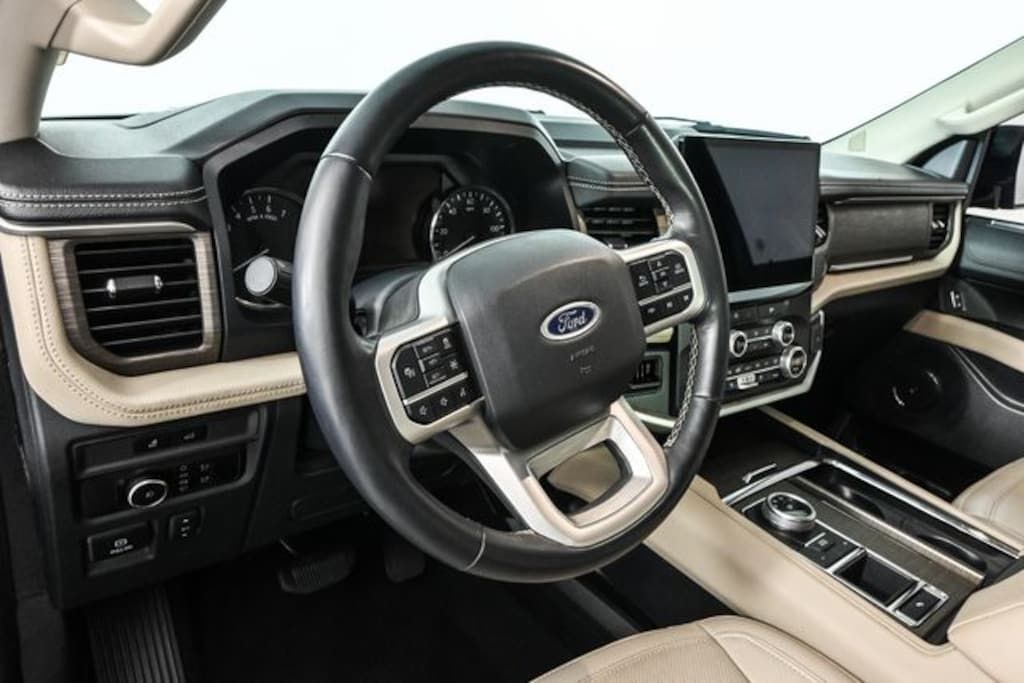 This 2024 Ford Expedition is equipped with Equipment Group 301A Mid Package, Expedition Limited, 4D Sport Utility, EcoBoost 3.5L V6 GTDi DOHC 24V Twin Turbocharged, RWD, Agate Black Metallic, Light Sandstone w/Heated/Ventilated Prem Lthr Front Captain's Chairs, 12 Speakers, 3.31 Axle Ratio, 3rd row seats: split-bench, 4-Wheel Disc Brakes, ABS brakes, Adjustable pedals, Air Conditioning, Alloy wheels, AM/FM radio: SiriusXM with 360L, Auto High-beam Headlights, Auto-dimming door mirrors, Auto-dimming Rear-View mirror, Automatic temperature control, Brake assist, Bumpers: body-color, Compass, Delay-off headlights, Driver door bin, Driver vanity mirror, Dual front impact airbags, Dual front side impact airbags, Electronic Stability Control, Emergency communication system: SYNC 4 911 Assist, Exterior Parking Camera Rear, Four wheel independent suspension, Front anti-roll bar, Front Bucket Seats, Front Center Armrest, Front dual zone A/C, Front fog lights, Front License Plate Bracket, Front reading lights, Fully automatic headlights, Garage door transmitter, Heated & Ventilated Leather Front Captain's Chairs, Heated door mirrors, Heated front seats, Heated rear seats, Heated steering wheel, Illuminated entry, Leather steering wheel, Low tire pressure warning, Memory seat, Navigation system: Connected Navigation, Occupant sensing airbag, Outside temperature display, Overhead airbag, Overhead console, Panic alarm, Passenger door bin, Passenger vanity mirror, Pedal memory, Power door mirrors, Power driver seat, Power Liftgate, Power moonroof, Power passenger seat, Power steering, Power windows, Radio data system, Radio: B&O Sound System by Bang & Olufsen, Rain sensing wipers, Rear air conditioning, Rear anti-roll bar, Rear reading lights, Rear window defroster, Rear window wiper, Reclining 3rd row seat, Remote keyless entry, Security system, SiriusXM w/360L, Speed control, Speed-sensing steering, Speed-Sensitive Wipers, Split folding rear seat, Spoiler, Steering wheel memory, Steering wheel mounted audio controls, SYNC 4 w/Enhanced Voice Recognition, Tachometer, Telescoping steering wheel, Tilt steering wheel, Traction control, Trip computer, Turn signal indicator mirrors, Variably intermittent wipers, Ventilated front seats, Voltmeter, and Wheels: 20" Bright Machined Aluminum.