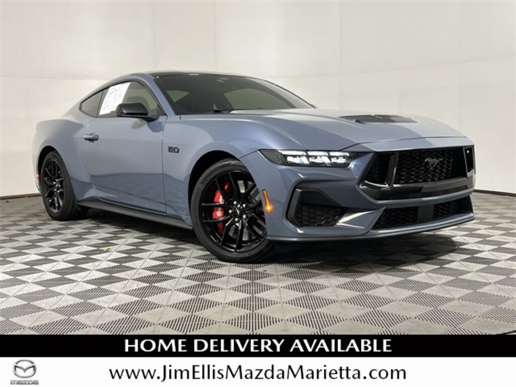 Jim Ellis Mazda Marietta is very proud to offer this stunning 2024 Ford Mustang GT Premium in Vapor Blue Metallic, Beautifully equipped with Equipment Group 401A High Package (B&O Sound System by Bang & Olufsen, Illuminated Door-Sill Scuff Plates, Integrated Turn Signals, Leather-Trimmed Bucket Seats w/Color Accents, and Memory Driver Seat & Mirrors), Ford Co-Pilot360 Assist+ (Connected Built-In Navigation and Pre-Collision Assist w/Automatic Emergency Braking), Mustang Nite Pony Package (Black GT Pony Badges, Black Mirror Caps, Headlamps w/Black Bezels, and Painted Black Roof), Mustang Nite Pony Package w/Shadow Black Paint, Security Package (Active Anti-Theft System, Locking Center Console, and Wheel Locking Kit), Active Valve Performance Exhaust, 19" Branded Brake System w/Performance Linings, 4-Wheel Disc Brakes, 9 Speakers, ABS brakes, Air Conditioning, Alloy wheels, AM/FM radio: SiriusXM with 360L, AM/FM Stereo, Auto High-beam Headlights, Auto-dimming Rear-View mirror, Automatic temperature control, Brake assist, Bumpers: body-color, Climate Controlled Heated/Cooled Front Seats, Compass, Delay-off headlights, Driver door bin, Driver vanity mirror, Dual front impact airbags, Dual front side impact airbags, Electronic Stability Control, Emergency communication system: 911 Assist, Exterior Parking Camera Rear, Four wheel independent suspension, Front anti-roll bar, Front Bucket Seats, Front Center Armrest, Front dual zone A/C, Front reading lights, Fully automatic headlights, Garage door transmitter, HD Radio, Heated door mirrors, Heated front seats, Heated steering wheel, Illuminated entry, Knee airbag, Leather Shift Knob, Leather steering wheel, Leather-Trimmed Bucket Seats, Low tire pressure warning, Occupant sensing airbag, Outside temperature display, Overhead airbag, Overhead console, Panic alarm, Passenger door bin, Passenger vanity mirror, Power door mirrors, Power driver seat, Power passenger seat, Power steering, Power windows, Radio data system, Rain sensing wipers, Rear anti-roll bar, Rear Parking Sensors, Rear window defroster, Red Painted Brake Calipers w/White Logo, Remote keyless entry, SiriusXM w/360L, Speed control, Speed-sensing steering, Speed-Sensitive Wipers, Split folding rear seat, Spoiler, Sport steering wheel, Steering wheel mounted audio controls, SYNC 4.0 QNX, Tachometer, Telescoping steering wheel, Tilt steering wheel, Traction control, Trip computer, Turn signal indicator mirrors, Variably intermittent wipers, Ventilated front seats, Voltmeter, Wheels: 19" x 8.5" Ebony Black-Painted Aluminum, and Wheels: 19" x 8.5" Shadow Silver-Painted Aluminum. Recent Arrival!