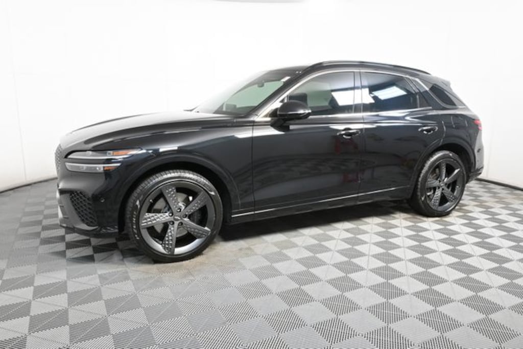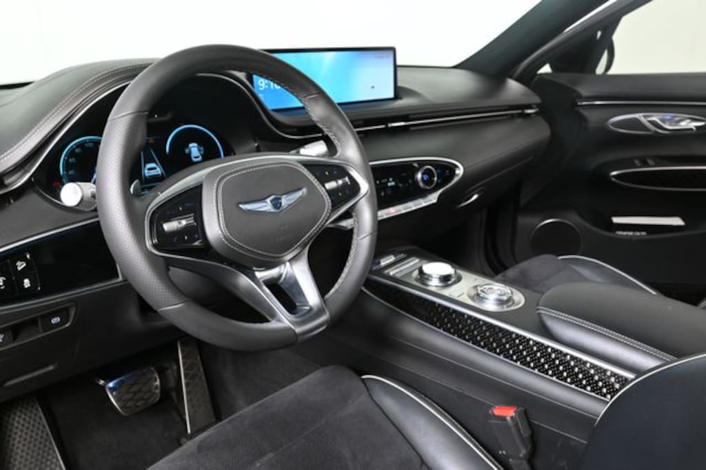 This 2022 Genesis GV70 is equipped with GV70 3.5T Sport Prestige, 4D Sport Utility, 3.5L DOHC, AWD, Vik Black, Black w/Leather Seating Surfaces w/Mesh Insert or Nappa Leather Seating Surfaces w/Sport Quilting or Nappa Leather Seating Surfaces w/Suede Inserts, 3.909 Axle Ratio, 4-Wheel Disc Brakes, 9 Speakers, ABS brakes, Adaptive suspension, Air Conditioning, Alloy wheels, AM/FM radio: SiriusXM, Android Auto & Apple CarPlay, Anti-whiplash front head restraints, Auto High-beam Headlights, Auto-dimming door mirrors, Auto-dimming Rear-View mirror, Automatic temperature control, Brake assist, Bumpers: body-color, Delay-off headlights, Driver door bin, Driver vanity mirror, Dual front impact airbags, Dual front side impact airbags, Electronic Stability Control, Emergency communication system, Exterior Parking Camera Rear, Four wheel independent suspension, Front anti-roll bar, Front Bucket Seats, Front Center Armrest w/Storage, Front dual zone A/C, Front reading lights, Fully automatic headlights, Garage door transmitter: HomeLink, Heated door mirrors, Heated front seats, Illuminated entry, Knee airbag, Leather Seating Surfaces w/Mesh Insert, Low tire pressure warning, Memory seat, Navigation System, Occupant sensing airbag, Outside temperature display, Overhead airbag, Overhead console, Panic alarm, Passenger door bin, Passenger vanity mirror, Power door mirrors, Power driver seat, Power Liftgate, Power moonroof, Power passenger seat, Power steering, Power windows, Radio: AM/FM/SiriusXM/HD Premium Audio System, Rain sensing wipers, Rear anti-roll bar, Rear Parking Sensors, Rear reading lights, Rear seat center armrest, Rear window defroster, Rear window wiper, Remote keyless entry, Security system, Speed control, Speed-sensing steering, Speed-Sensitive Wipers, Split folding rear seat, Spoiler, Steering wheel memory, Steering wheel mounted audio controls, Tachometer, Telescoping steering wheel, Tilt steering wheel, Traction control, Trip computer, Turn signal indicator mirrors, Variably intermittent wipers, Ventilated Front AND Rear Seats, Ventilated front seats, and Wheels: 19" Sport Dark Hyper Silver Aluminum.