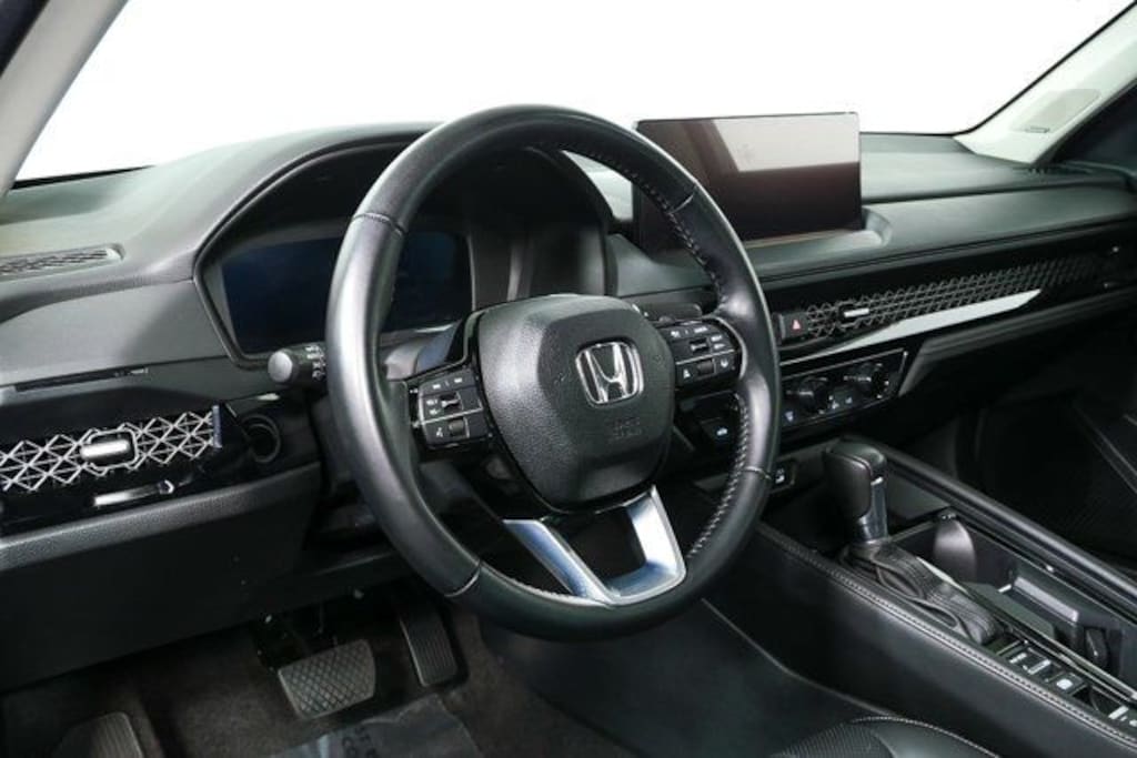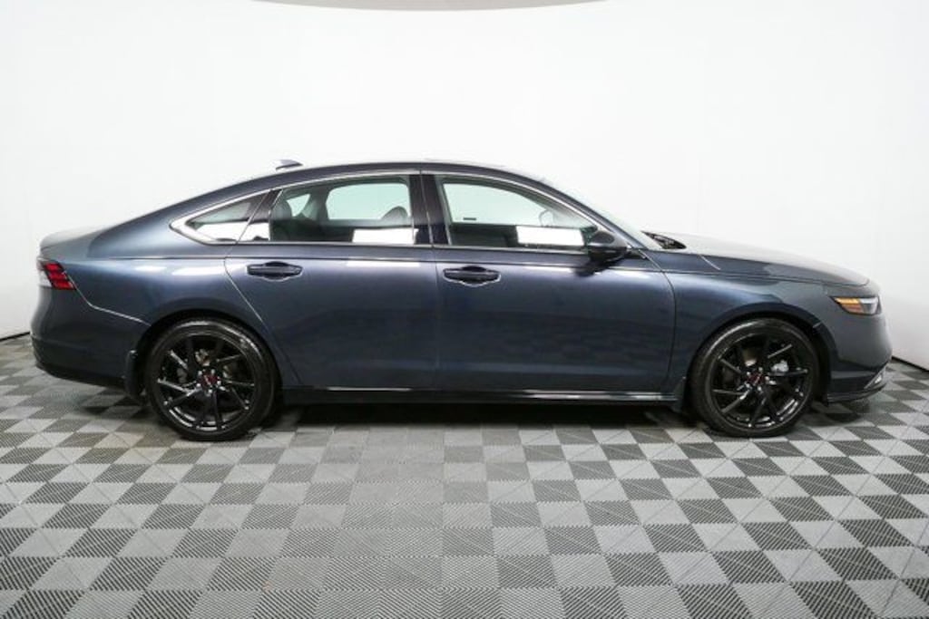 The 2024 Honda Accord Hybrid Touring in Meteorite Gray Metallic combines sleek styling with a fuel-efficient hybrid powertrain and advanced technology for a refined driving experience. Inside, the Black leather-trimmed cabin features heated and ventilated seats, a premium Bose audio system, and an intuitive 12.3" touchscreen with navigation and smartphone integration. Safety and driver-assist technologies are comprehensive, including collision mitigation, adaptive cruise control with low-speed follow, blind-spot monitoring, and a full suite of airbags. Its hybrid drivetrain delivers impressive efficiency, while the Touring trim adds luxury touches and performance-oriented handling.
