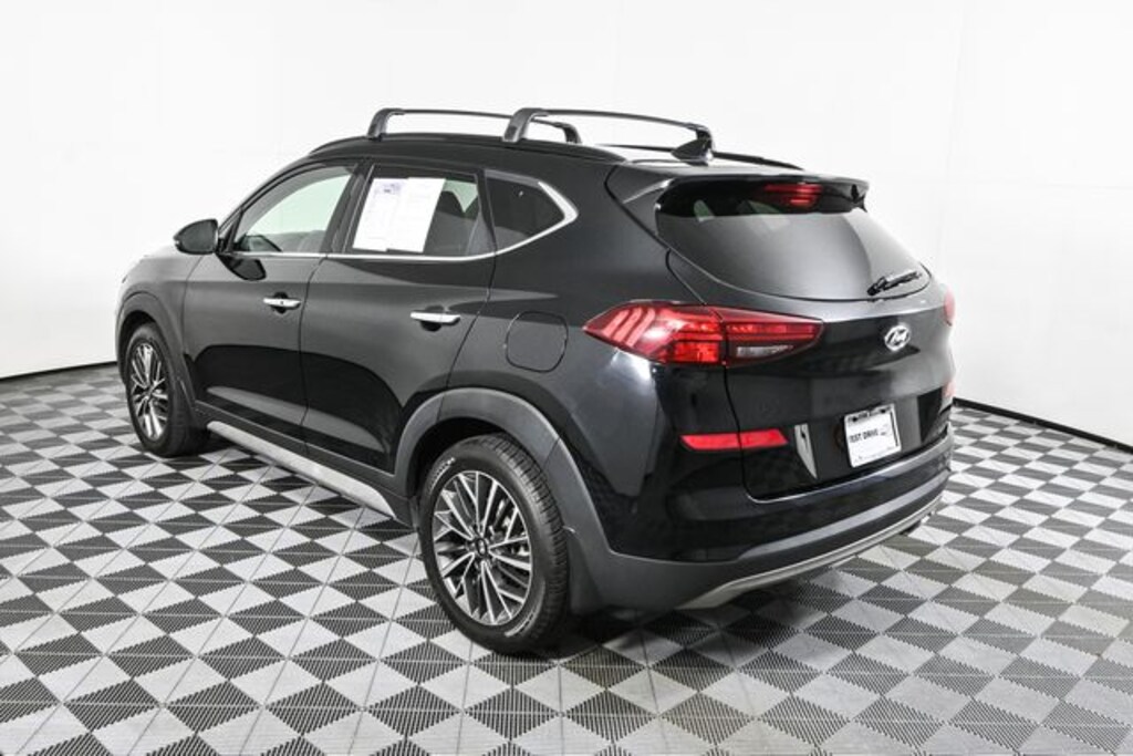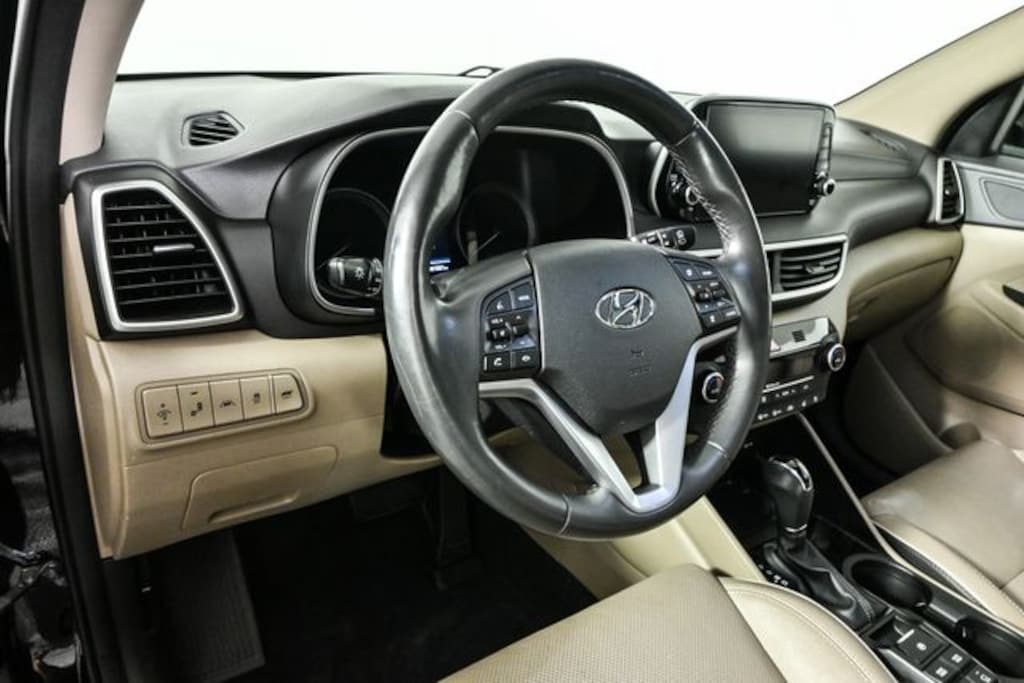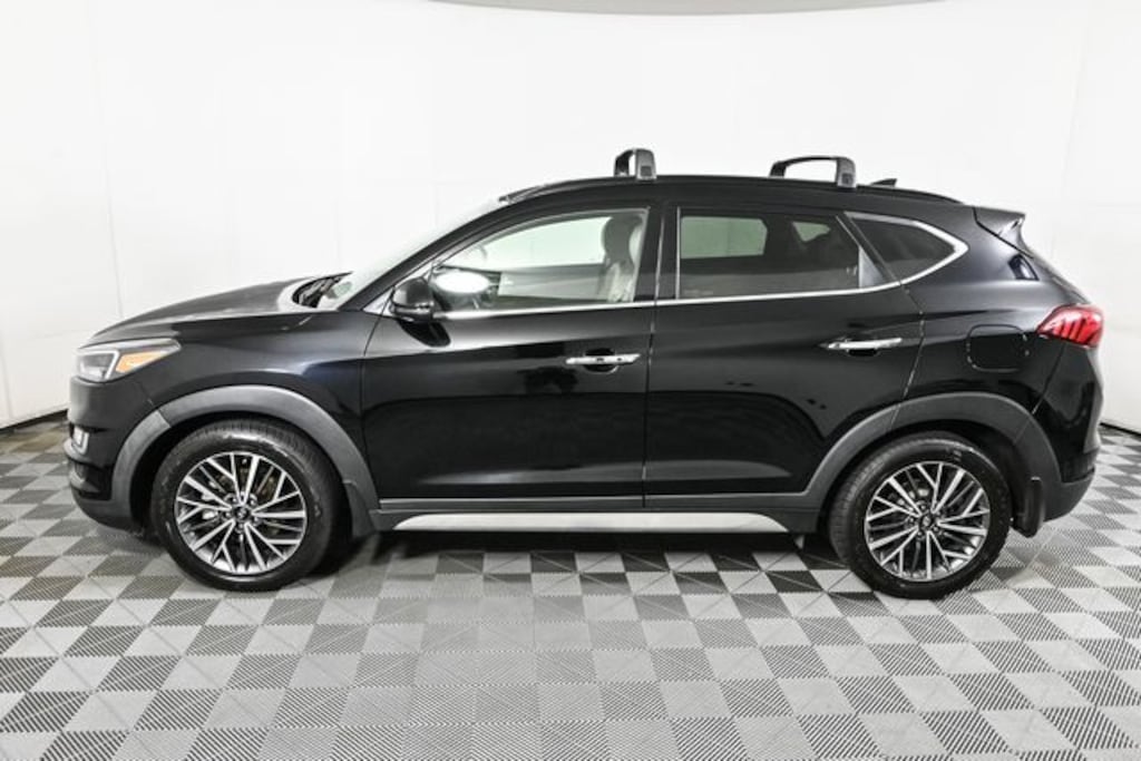 This 2021 Hyundai Tucson is equipped with Option Group 01, Tucson Ultimate, 4D Sport Utility, 2.4L I4 DGI DOHC 16V, FWD, Black Noir Pearl, Beige w/Leather Seat Trim, 18" x 7.0J Alloy Wheels, 4-Wheel Disc Brakes, 8 Speakers, ABS brakes, Air Conditioning, Alloy wheels, AM/FM radio: SiriusXM, Apple CarPlay & Android Auto, Auto High-beam Headlights, Auto-dimming Rear-View mirror, Automatic temperature control, Axle Ratio: 3.064, Brake assist, Bumpers: body-color, Cargo Net, Carpeted Floor Mats, Cross Bars, Delay-off headlights, Driver door bin, Driver vanity mirror, Dual front impact airbags, Dual front side impact airbags, Electronic Stability Control, Emergency communication system: Blue Link Connected Car Service (3-year complimentary subscription), First Aid Kit, Four wheel independent suspension, Front anti-roll bar, Front Bucket Seats, Front Center Armrest, Front dual zone A/C, Front fog lights, Front reading lights, Fully automatic headlights, Garage door transmitter: HomeLink, Heated door mirrors, Heated front seats, Heated rear seats, Heated steering wheel, Illuminated entry, Leather Seat Trim, Leather Shift Knob, Low tire pressure warning, Mudguards, Navigation System, Occupant sensing airbag, Outside temperature display, Overhead airbag, Overhead console, Panic alarm, Passenger door bin, Passenger vanity mirror, Power door mirrors, Power driver seat, Power Liftgate, Power moonroof, Power passenger seat, Power steering, Power windows, Radio: Infinity Audio System w/Navigation, Rain sensing wipers, Rear anti-roll bar, Rear reading lights, Rear seat center armrest, Rear window defroster, Rear window wiper, Remote keyless entry, Reversible Cargo Tray, Roof rack: rails only, Security system, Speed control, Speed-sensing steering, Split folding rear seat, Spoiler, Steering wheel mounted audio controls, Tachometer, Telescoping steering wheel, Tilt steering wheel, Traction control, Trip computer, Turn signal indicator mirrors, Variably intermittent wipers, Ventilated Front AND Rear Seats, and Ventilated front seats.