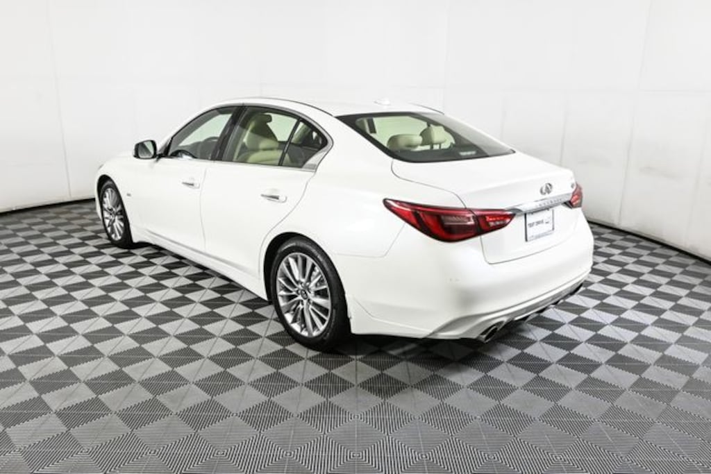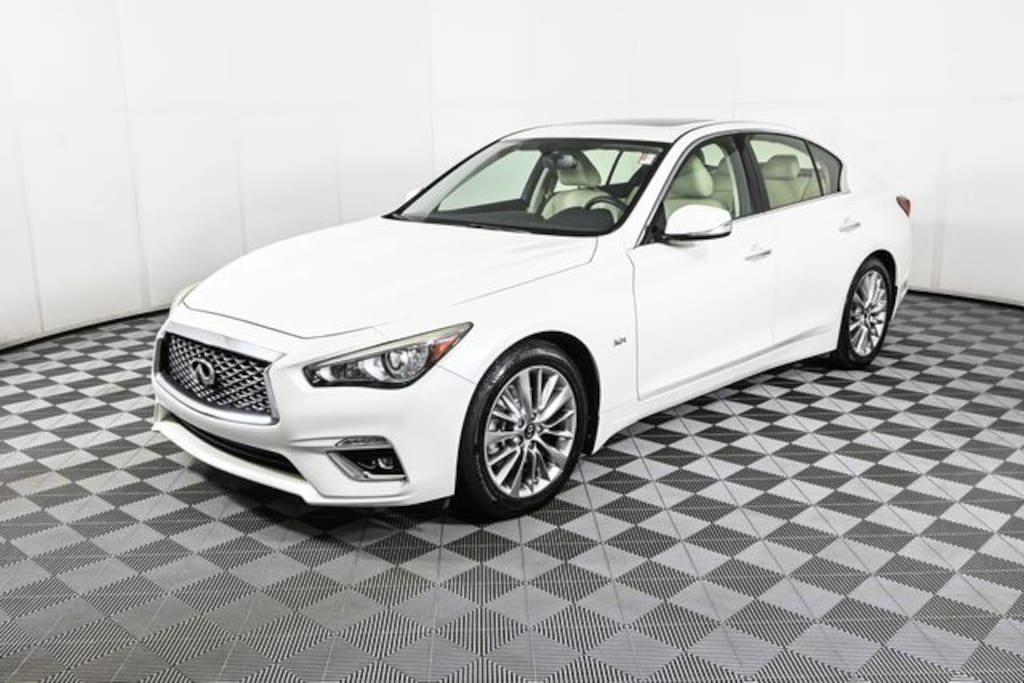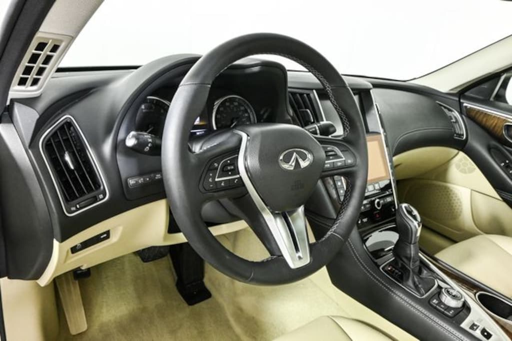 This 2018 INFINITI Q50 is equipped with Cargo Package (L95) (First Aid Kit), Essential Package (3.0t LUXE) (Driver Seat Power Lumbar), Q50 3.0t LUXE, 3.0L V6, RWD, Majestic White, Wheat w/Leatherette Seating Surfaces, 18" x 7.5" Aluminum Alloy Wheels, 4-Wheel Disc Brakes, 6 Speakers, ABS brakes, Activation Disclaimer, Air Conditioning, Alloy wheels, AM/FM radio: SiriusXM, Anti-whiplash front head restraints, Auto-dimming Rear-View mirror, Automatic temperature control, Brake assist, Bumpers: body-color, CD player, Compass, Delay-off headlights, Driver door bin, Driver vanity mirror, Dual front impact airbags, Dual front side impact airbags, Electronic Stability Control, Four wheel independent suspension, Front anti-roll bar, Front Bucket Seats, Front Center Armrest, Front dual zone A/C, Front fog lights, Front reading lights, Fully automatic headlights, Garage door transmitter: HomeLink, Genuine wood console insert, Genuine wood dashboard insert, Genuine wood door panel insert, Heated door mirrors, Illuminated entry, Leather Shift Knob, Leather steering wheel, Leatherette Seating Surfaces, Literature Kit, Low tire pressure warning, Occupant sensing airbag, Outside temperature display, Overhead airbag, Overhead console, Panic alarm, Passenger door bin, Passenger vanity mirror, Power door mirrors, Power driver seat, Power moonroof, Power passenger seat, Power steering, Power windows, Premium Paint, Radio data system, Radio: AM/FM/CD w/MP3 Playback Capability, Rain sensing wipers, Rear anti-roll bar, Rear reading lights, Rear seat center armrest, Rear window defroster, Remote keyless entry, Security system, Speed control, Speed-sensing steering, Speed-Sensitive Wipers, Splash Guards, Steering wheel mounted audio controls, Tachometer, Telescoping steering wheel, Tilt steering wheel, Traction control, Trip computer, Turn signal indicator mirrors, and Variably intermittent wipers.