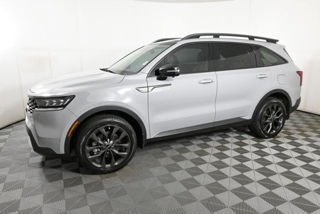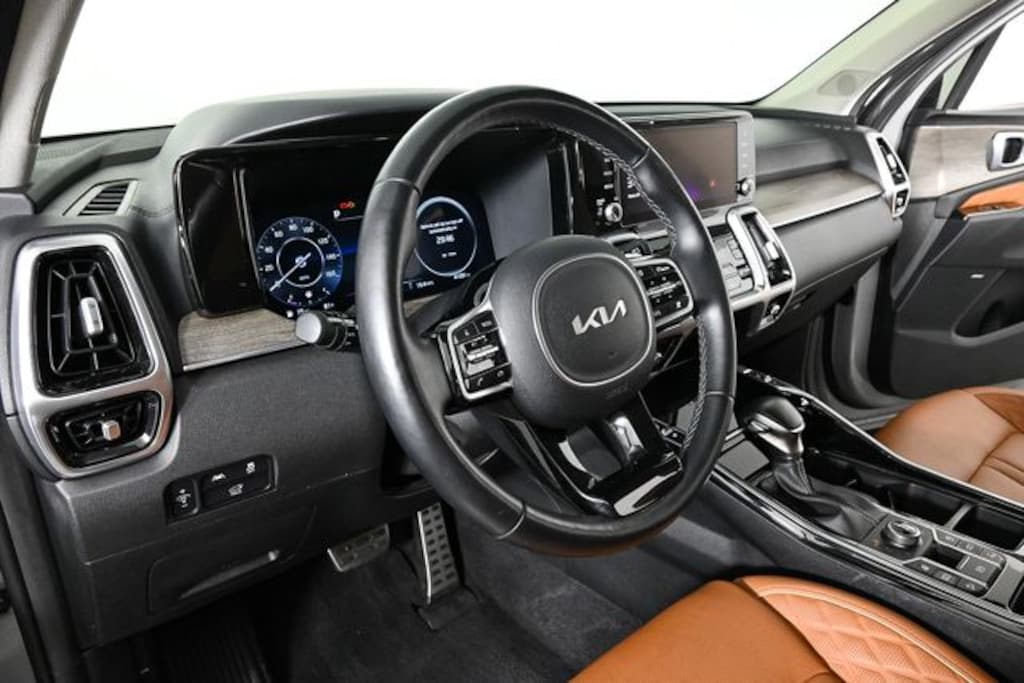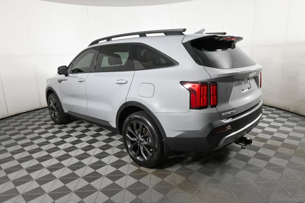 This 2023 Kia Sorento is equipped with X-Line Rust Interior Color Package, Sorento X-Line SX Prestige AWD, 4D Sport Utility, 2.5L I4 DGI Turbocharged DOHC 16V LEV3-ULEV70 281hp, AWD, Wolf Gray, 12 Speakers, 3.316 Axle Ratio, 3rd row seats: split-bench, 4-Wheel Disc Brakes, ABS brakes, Air Conditioning, Alloy wheels, AM/FM radio: SiriusXM, Apple CarPlay & Android Auto, Auto High-beam Headlights, Auto-dimming Rear-View mirror, Automatic temperature control, Brake assist, Bumpers: body-color, Carpet Floor Mats, Delay-off headlights, Driver door bin, Driver vanity mirror, Dual front impact airbags, Dual front side impact airbags, Electronic Stability Control, Emergency communication system, Four wheel independent suspension, Front anti-roll bar, Front Bucket Seats, Front Center Armrest, Front dual zone A/C, Front fog lights, Front reading lights, Fully automatic headlights, Garage door transmitter: HomeLink, Heated door mirrors, Heated front seats, Heated rear seats, Heated steering wheel, Illuminated entry, Illuminated Hatch Sill Plate, Knee airbag, Leather steering wheel, Low tire pressure warning, Memory seat, Mudguards, Navigation System, Occupant sensing airbag, Outside temperature display, Overhead airbag, Overhead console, Panic alarm, Passenger door bin, Passenger vanity mirror, Perforated Genuine Leather Seat Trim, Power door mirrors, Power driver seat, Power Liftgate, Power moonroof, Power passenger seat, Power steering, Power windows, Radio data system, Radio: AM/FM Bose Premium Audio System, Rain sensing wipers, Rear air conditioning, Rear anti-roll bar, Rear reading lights, Rear window defroster, Rear window wiper, Remote keyless entry, Roof rack: rails only, Security system, Smart Key w/ Push Button and Remote Start, Speed control, Speed-sensing steering, Split folding rear seat, Spoiler, Steering wheel mounted audio controls, Tachometer, Telescoping steering wheel, Tilt steering wheel, Tow Hitch PnP (Turbo Only), Traction control, Trip computer, Turn signal indicator mirrors, Variably intermittent wipers, Ventilated Front AND Rear Seats, Ventilated front seats, and Wheels: 8.5J x 20" Matte Gray Alloy.
