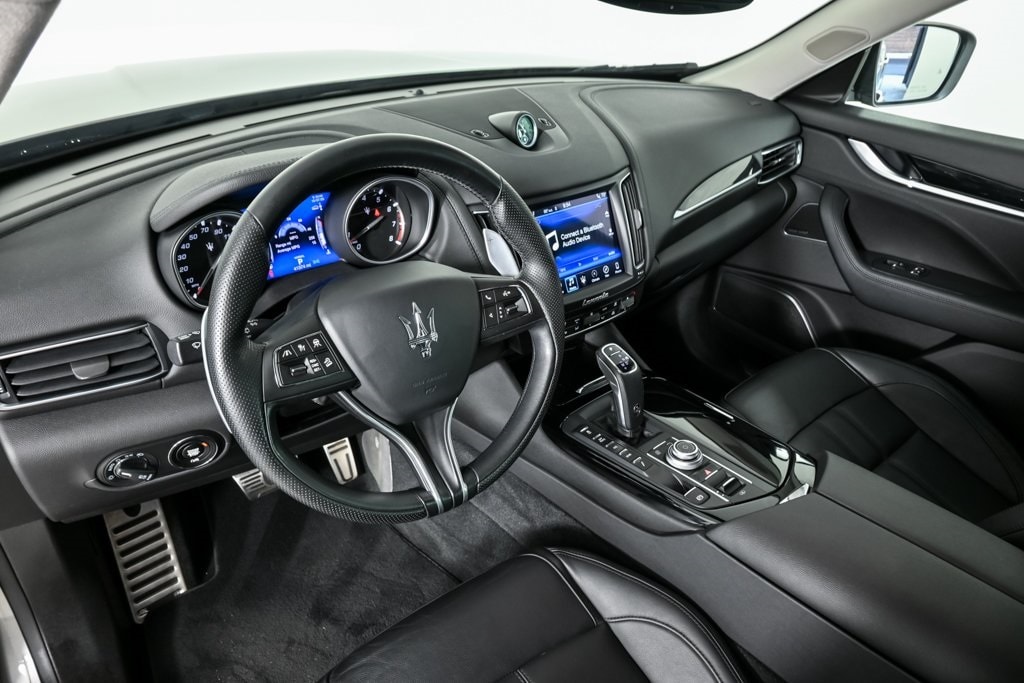 Inside, the cabin is richly appointed with premium materials, Piano Black and metal-look trim, and a Sport Heated Leather Steering Wheel. The Maserati Touch Control Plus system features an 8.4-inch touchscreen with navigation, Apple CarPlay, Android Auto, Bluetooth, and a 14-speaker audio system. Convenience features include a power panoramic sunroof, power tilt/telescoping steering column, adaptive cruise control with stop & go, and soft-close doors.