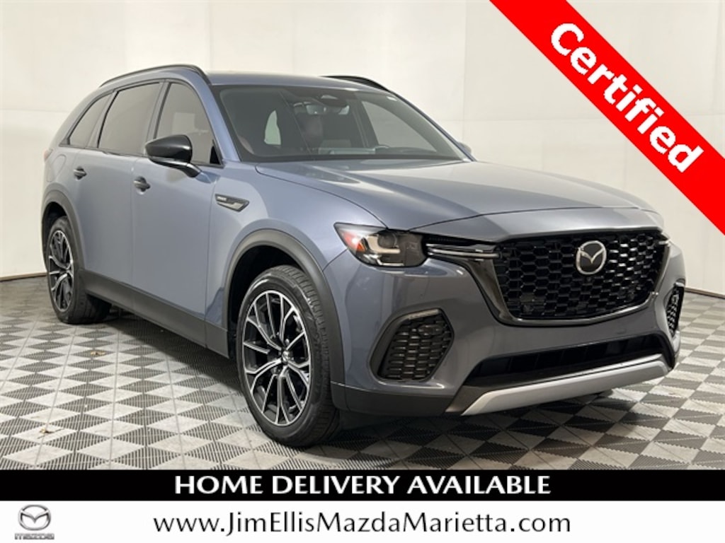 Jim Ellis Mazda Marietta is delighted to offer this good-looking 2025 Mazda CX-70 PHEV Premium Plus in Polymetal Gray Metallic, Beautifully equipped with Mazda Certified Pre-Owned Certified, 12 Speakers, 4-Wheel Disc Brakes, ABS brakes, Air Conditioning, Alloy wheels, AM/FM radio: SiriusXM, Auto High-beam Headlights, Auto-dimming door mirrors, Auto-dimming Rear-View mirror, Automatic temperature control, Brake assist, Bumpers: body-color, Compass, Delay-off headlights, Driver door bin, Driver vanity mirror, Dual front impact airbags, Dual front side impact airbags, E911 Automatic Emergency Notification, Electronic Stability Control, Emergency communication system: MAZDA CONNECT, Four wheel independent suspension, Front anti-roll bar, Front Bucket Seats, Front Center Armrest w/Storage, Front dual zone A/C, Front reading lights, Fully automatic headlights, Garage door transmitter: HomeLink, Heads-Up Display, Heated door mirrors, Heated front seats, Heated rear seats, Heated steering wheel, Heated/Ventilated Front Bucket Seats, Illuminated entry, Infotainment System Voice Command, Knee airbag, Leather Shift Knob, Leather steering wheel, Low tire pressure warning, Mazda Connected Services, Mazda Online Navigation, Memory seat, Nappa Leather Seat Trim, Navigation system: MAZDA CONNECT, Occupant sensing airbag, Outside temperature display, Overhead airbag, Overhead console, Pandora Internet Radio Integration, Panic alarm, Passenger door bin, Passenger vanity mirror, Polymetal Gray Metallic Paint Charge, Power door mirrors, Power driver seat, Power Liftgate, Power moonroof, Power passenger seat, Power steering, Power windows, Radio Broadcast Data System Program Information, Radio data system, Radio: AM/FM w/Bose Premium Audio Sound System, Rain sensing wipers, Rear air conditioning, Rear anti-roll bar, Rear reading lights, Rear seat center armrest, Rear window defroster, Rear window wiper, Remote keyless entry, Security system, SMS Text Msg Audio Delivery & Reply, Speed control, Speed-sensing steering, Split folding rear seat, Spoiler, Steering wheel mounted audio controls, Tachometer, Telescoping steering wheel, Tilt steering wheel, Traction control, Trip computer, Turn signal indicator mirrors, Variably intermittent wipers, Ventilated front seats, and Wheels: 21" x 9.5J Aluminum Alloy. Odometer is 625 miles below market average!