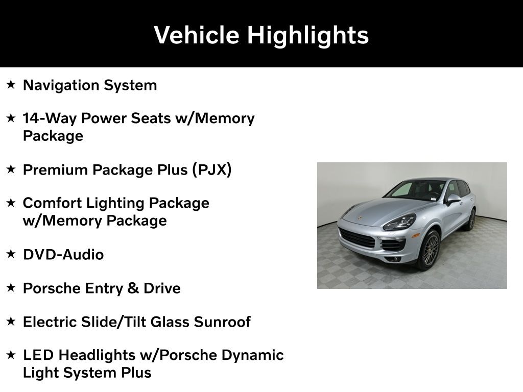 Clean CARFAX. Rhodium Silver Metallic 2017 Porsche Cayenne Platinum Edition AWD 8-Speed Automatic with Tiptronic 3.6L V6 Black w/Leather Seat Trim, 14-Way Power Seats w/Memory Package, Comfort Lighting Package w/Memory Package, DVD-Audio, Electric Slide/Tilt Glass Sunroof, Electric Sunblinds for Rear Side Windows, Front & Rear Seat Heating, Front Seat Ventilation, Heated front seats, Lane Change Assist (LCA), LED Headlights w/Porsche Dynamic Light System Plus, Navigation System, Porsche Entry & Drive, Premium Package Plus (PJX), Reversing Camera Including Front & Rear ParkAssist, Wheels: 20" RS Spyder Design in Satin Platinum.