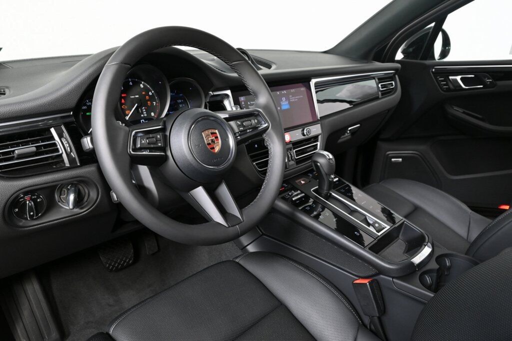 This vehicle is further equipped with 20-inch Macan Sport wheels in Satin Platinum, wheel center caps with the colored Porsche crest, and Porsche crests on the front headrests, rounding out both its styling and everyday usability.