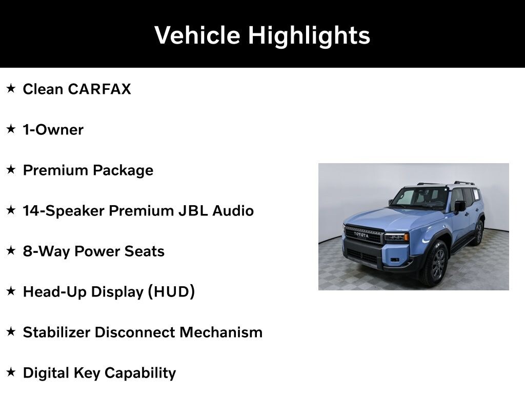 Elevate your driving experience with the Land Cruiser's impressive array of features, including a 14-Speaker Premium JBL Audio system, 8-Way Power Seats, Head-Up Display, Stabilizer Disconnect Mechanism, Digital Key Capability, and a Power Tilt/Slide Moonroof with Power Sunshade. Safety is paramount with the Pre-Collision System, Traffic Jam Assist, and Blind Spot Monitor with Lane Change Assist.
